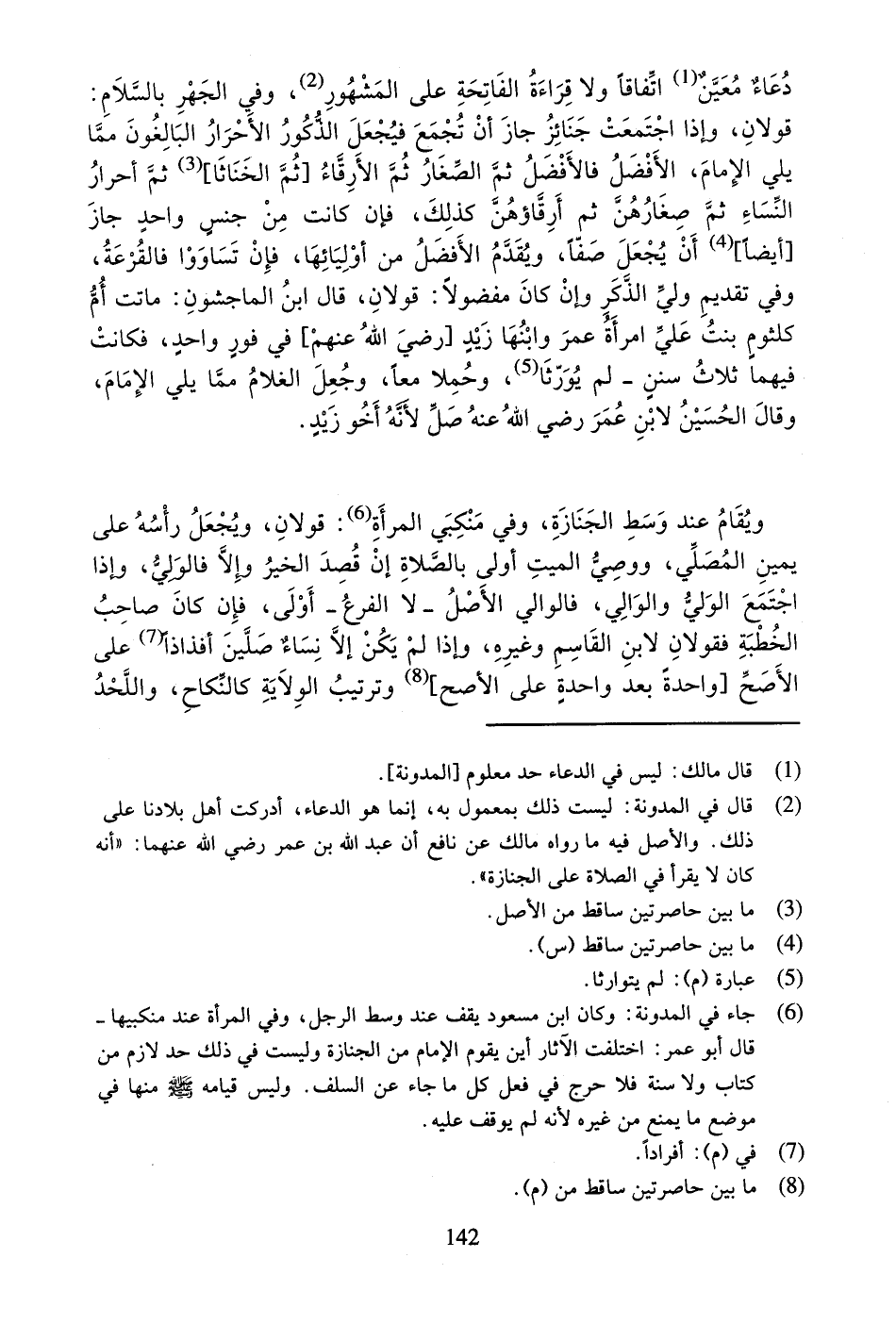 دُعَاءٌ مُعَيَّنٌ اتِّفَاقاً وَلا قِرَاءَةُ الْفَاتِحَةِ عَلَى الْمَشْهُورِ، وَفِي الْجَهْرِ بِالسَّلامِ: قَوْلانِ، وَإِذَا اجْتَمَعَتْ جَنَائِزُ جَازَ أَنْ تُجْمَعَ فَيُجْعَلَ الذُّكُورُ الأَحْرَارُ الْبَالِغُونَ مِمَّا يَلِي الإِمَامُ، الأَفْضَلُ فَالأَفْضَلُ ثُمَّ الصِّغَارُ ثُمَّ الأَرِقَّاءَ [ثُمَّ الْخَنَاثَا] ثُمَّ أَحْرَارُ النِّسَاءِ ثُمَّ صِغَارُهُنَّ ثُمَّ أَرِقَّاؤُهُنَّ كَذَلِكَ، فَإِنْ كَانَتْ مِنْ جِنْسٍ وَاحِدٍ جَازَ [أَيْضاً] أَنْ يُجْعَلَ صَفّاً، وَيُقَدَّمُ الأَفْضَلُ مِنْ أَوْلِيَائِهَا، فَإِنْ تَسَاوَوْا فَالْقُرْعَةُ، وَفِي تَقْدِيمِ وَلِيِّ الذَّكَرِ وَإِنْ كَانَ مَفْصُولاً: قَوْلانِ، قَالَ ابْنُ الْمَاجِشُونِ: مَاتَتْ أُمُّ كُلْثُومٍ بِنْتُ عَلِيٍّ امَرَأَةُ عُمَرَ وَابْنُهَا زَيْدٌ [رَضِيَ اللَّهُ عَنْهُمْ] فِي فَوْرٍ وَاحِدٍ، فَكَانَتْ فِيهِمَا ثَلاثُ سُنَنٍ -