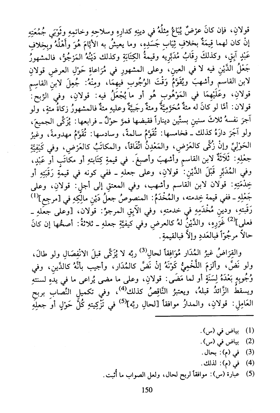 قَوْلانِ، فَإِنْ كَانَ عَرَضٌ يُبَاعُ مِثْلُهُ فِي دَيْنِهِ كَدَارِهِ وَسِلاحِهِ وَخَاتَمِهِ وَثَوْبَيْ جُمُعَتِهِ إِنْ كَانَ لَهُمَا قِيمَةٌ بِخِلافِ ثِيَابِ جَسَدِهِ، وَما يَعِيشُ بِهِ الأَيَّامَ هُوَ وَأَهْلُهُ وَبِخِلافِ عَبْدٍ آبِقٍ، وَكَذَلِكَ رِقَابُ مُدَبَّرِيهِ وَقِيمَةُ الْكِتَابَةِ وَكَذَلِكَ دَيْنُهُ الْمَرْجُوُّ، فَالْمَشْهُورُ جَعْلُ الدَّيْنِ فِيهِ لا فِي الْعَيْنِ، وَعَلَى الْمَشْهُورِ فِي مُرَاعَاةِ حَوْلِ الْعَرْضِ قَوْلانِ لابْنِ الْقَاسِمِ وَأَشْهَبَ وَيُقَوَُّمُ وَقْتُ الوُجُوبِ فِيهِمَا، وَمِنْهُ: جُعِلَ لابْنِ الْقَاسِمِ قَوْلانِ، وَعَلَيْهِمَا فِي الْمَوْهُوبِ هُوَ أَوْ مَا يُجْعَلُ فِيهِ: قَوْلانِ، وَفِي الرِّبْحِ: قَوْلانِ: أَمَّا لَوْ كَانَ لَهُ مِئَةٌ مُحَرَّمِيَّةٌ وَمِئَةٌ رَجَبِيَّةٌ وَعَلَيْهِ مِئَةٌ فَالْمَشْهُورُ زَكَاةُ مِئَةٍ، وَلَوْ آجَرَ نَفْسَهُ ثَلاثَ سِنِينَ بِسِتِّينَ دِينَاراً فَقَبَضَهَا فَمَرَّ حَوْلٌ - فَرَابِعُهَا: يُزَكَّى الْجَمِيعَ، وَلَوْ آجَرَ دَارَهُ كَذَلِكَ - فَخَامِسُهَا: تُقَوَّمُ سَالِمَةً، وَسَادِسُهَا: تُقَوَّمُ مَهْدُومَةً، وَغَيْرُ الْحَوْلِيِّ وَإِنْ زُكَّى كَالْعَرْضِ، وَالْمَعْدِنِ اتِّفَاقاً، وَالْمُكَاتَبُ كَالْعَرْضِ، وَفِي كَيْفِيَّةِ جَعْلِهِ: ثَلاثَةٌ لابْنِ الْقَاسِمِ وَأَشْهَبَ وَأَصْبَغَ.