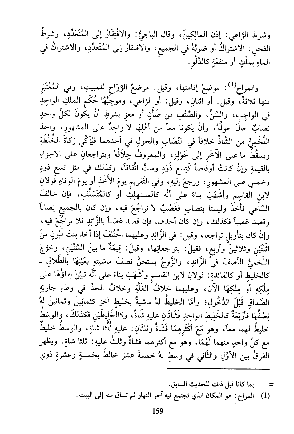 وَالْمَرَاحُ: مَوْضِعُ إِقَامَتِهَا، وَقِيلَ: مَوْضِعُ الرَّوَاحِ لِلْمَبِيتِ، وَفِي الْمُعْتَبَرِ، مِنْهَا ثَلاثَةٌ، وَقِيلَ: أَوِ اثْنَانِ، وَقِيلَ: أَوِ الرَّاعِي، وَمُوجِبُهَا حُكْمُ الْمَلِكِ الْوَاحِدِ فِي الوَاجِبِ، وَالسِّنِّ، وَالصِّنْفِ مِنْ ضَأْنٍ أَوْ مَعَزٍ بِشَرْطِ أَنْ يَكُونَ لِكُلِّ وَاحِدٍ نِصَابٌ حَالَ حَوْلُهُ، وَأَنْ يَكُونَا مَعاً مِنْ أَهْلِهَا لا وَاحِدٌ عَلَى الْمَشْهُورِ، وَأَخَذَ اللَّخْمِيُّ مِنَ الشَّاذِّ خِلافاً فِي النِّصَابِ وَالْحَوْلِ فِي أَحَدِهِمَا فَيُزَكِّي زَكَاةَ الْخُلْطَةِ وَيَسْقُطُ مَا عَلَى الآخَرِ إِلَى حَوْلِهِ، وَالْمَعْرُوفُ خِلافُهُ وَيَتَرَاجَعَانِ عَلَى الأَجْزَاءِ بِالْقِيمَةِ وَإِنْ كَانَتْ أَوْقَاصاً كَتِسْعٍ ذَوْدٍ وَسِتٍّ اتِّفَاقاً، وَكَذَلِكَ فِي مِثْلِ تِسْعِ ذَوْدٍ وَخَمْسِينَ عَلَى الْمَشْهُورِ، وَرَجَعَ إِلَيْهِ، وَفِي التَّقْوِيمِ يَوْمَ الأَخْذِ أَوْ يَوْمَ الْوَفَاءِ قَوْلانِ لابْنِ الْقَاسِمِ وَأَشْهَبَ بِنَاءً عَلَى أَنَّهُ كَالْمُسْتَهْلِكِ أَوْ كَالْمُتَسَلِّفِ، فَإِنْ خَالَفَ السَّاعِي فَأَخَذَ وَلَيْسَتَا بِنِصَابٍ فَغَصْبٌ لا تَرَاجُعَ فِيهِ، وَإِنْ كَانَ بِالْجَمِيعِ نِصَاباً وَقَصَدَ غَصْباً فَكَذَلِكَ، وَإِنْ كَانَ أَحَدُهُمَا فَإِنْ قَصَدَ غَصْباً بِالزَّائِدِ فَلا تَرَاجُعَ فِيهِ، وَإِنْ كَانَ بِتَأْوِيلٍ تَرَاجَعَا، وَقِيلَ: فِي الزَّائِدِ وَعَلَيْهِمَا اخْتُلِفَ إِذَا أَخَذَ بِنْتَ لَبُونٍ مِنِ اثْنَتَيْنِ وَثَلاثِينَ وَأَرْبَعٍ، فَقِيلَ: يَتَرَاجَعَانِهَا، وَقِيلَ: قِيمَةٌ مَا بَيْنَ السِّنَّيْنِ، وَخَرَّجَ اللَّخْمِيُّ النِّصْفَ فِي الزَّائِدِ، وَالزَّوْجُ يَسْتَحِقُّ نِصْفَ مَاشِيَتِهِ بِعَيْنِهَا بِالطَّلاقِ - كَالْخَلِيطِ