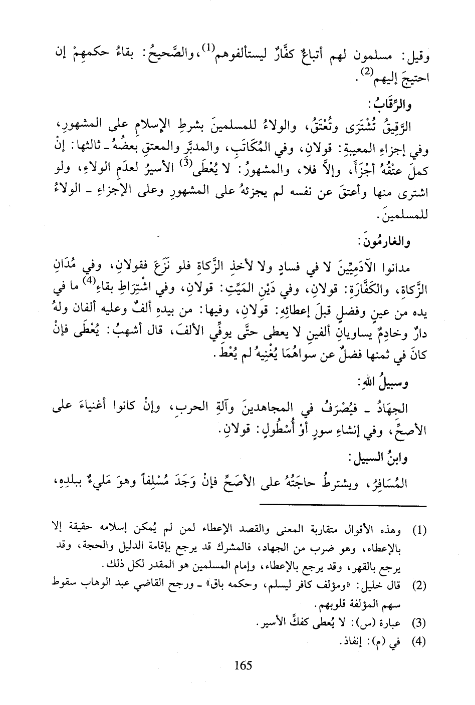 الرَّقِيقُ تُشْتَرَى وَتُعْتَقَ، وَالْوَلاءُ لِلْمُسْلِمِينَ بِشَرْطِ الإِسْلامِ عَلَى الْمَشْهُورِ، وَفِي إِجْزَاءِ الْمَعِيبَةِ: قَوْلانِ، وَفِي الْمُكَاتَبِ، وَالْمُدَبَّرِ وَالْمُعْتَقِ بَعْضُهُ - ثَالِثُهَا: إِنْ كَمُلَ عِتْقُهُ أَجْزَأَ، وَإِلا فَلا، وَالْمَشْهُورُ: لا يُعْطَى كَفَكِّ الأَسِيرِ لِعَدَمِ الْوَلاءِ، وَلَوِ اشْتَرَى مِنْهَا وَأَعْتَقَ عَنْ نَفْسِهِ لَمْ يُجْزِئْهُ عَلَى الْمَشْهُورِ وَعَلَى الإِجْزَاءِ - الْوَلاءُ لِلْمُسْلِمِينَ.