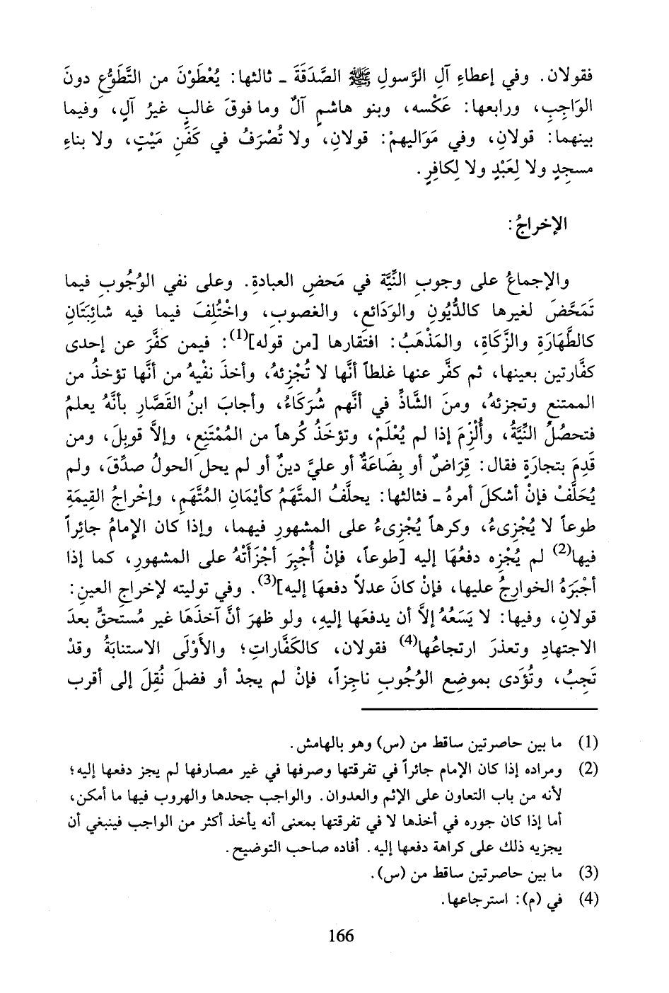 وَالإِجْمَاعُ عَلَى وُجُوبِ النِّيَّةِ فِي مَحْضِ الْعِبَادَةِ. وَعَلَى نَفْيِ الْوُجُوبِ فِيمَا تَمَحَّضَ لِغَيْرِهَا كَالدُّيُونِ وَالْوَدَائِعِ، وَالْغُصُوبِ، وَاخْتُلِفَ فِيمَا فِيهِ شَائِبَتَانِ كَالطَّهَارَةِ وَالزَّكَاةِ، وَالْمَذْهَبُ: افْتِقَارُهَا [مِنْ قَوْلِهِ]: فِيمَنْ كَفَّرَ عَنْ إِحْدَى كَفَّارَتَيْنِ بِعَيْنِهَا، ثُمَّ كَفَّرَ عَنْهَا غَلَطاً أَنَّهَا لا تُجْزِئُهُ، وَأُخِذَ نَفْيُهُ مِنْ أَنَّهَا تُؤْخَذُ مِنَ الْمُمْتَنِعِ وَتُجْزِئُهُ، وَمِنَ الشَّاذِّ فِي أَنَّهُمْ شُرَكَاءُ، وَأَجَابَ ابْنُ الْقَصَّارِ بِأَنَّهُ يَعْلَمُ فَتَحْصُلُ النِّيَّةُ، وَأَلْزَمَ إِذَا لَمْ يَعْلَمْ، وَتُؤْخَذُ كُرْهاً مِنَ الْمُمْتَنِعِ، وَإِلا قُوبِلَ، وَمَنْ قَدِمَ بِتِجَارَةٍ فَقَالَ: قِرَاضٌ أَوْ بِضَاعَةٌ أَوْ عَلَيَّ دَيْنٌ أَوْ لَمْ يَحُلِ الْحَوْلُ صُدِّقَ، وَلَمْ يَحْلِفْ فَإِنْ أُشْكِلَ أَمْرُهُ - فَثَالِثُهَا: يَحْلِفُ الْمُتَّهَمُ كَأَيْمَانِ الْمُتَّهَمِ، وَإِخْرَاجُ الْقِيمَةِ طَوْعاً لا يُجْزِئُ، وَكُرْهَا يُجْزِئُ عَلَى الْمَشْهُورِ فِيهِمَا، وَإِذَا كَانَ الإِمَامُ جَائِراً فِيهَا لَمْ يُجْزِهِ دَفْعُهَا إِلَيْهِ [طَوْعاً، فَإِنْ أُجْبِرَ أَجْزَأَتْهُ عَلَى الْمَشْهُورِ، كَمَا إِذَا أَجْبَرَهُ الْخَوَارِجُ عَلَيْهَا، فَإِنْ كَانَ عَدْلاً دَفَعَهَا إِلَيْهِ]. وَفِي تَوْلِيَتِهِ لإِخْرَاجِ الْعَيْنِ: قَوْلانِ، وَفِيهَا: لا يَسَعُهُ إِلا أَنْ يَدْفَعَهَا إِلَيْهِ، وَلَوْ ظَهَرَ أَنَّ أَخْذَهَا غَيْرُ مُسْتَحَقٍّ بَعْدَ الاجْتِهَادِ وَتَعَذَّرَ ارْتِجَاعُهَا (¬1)