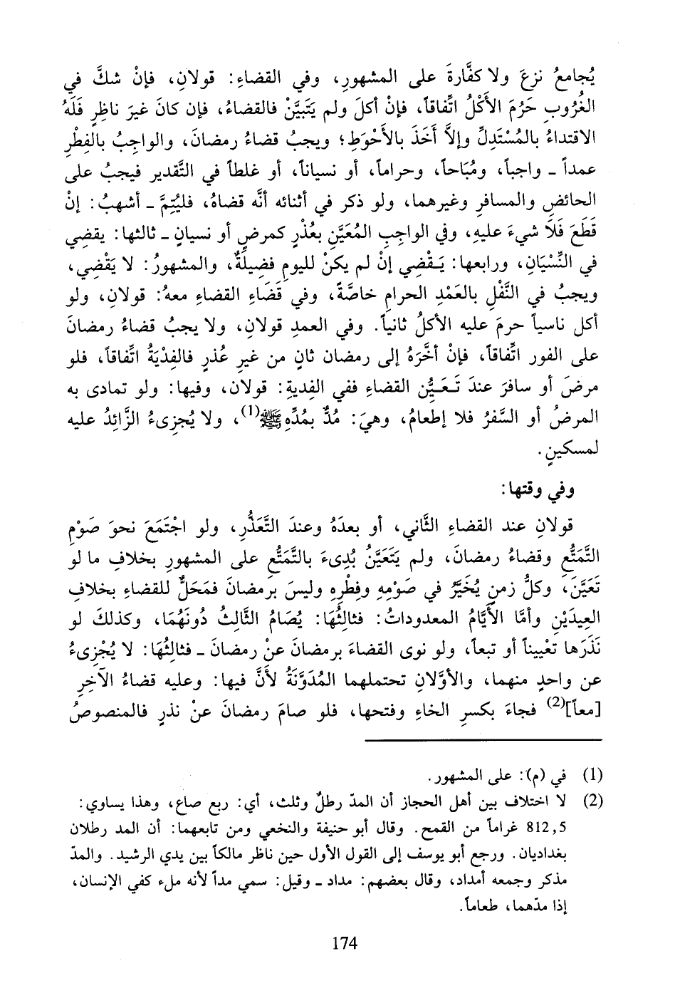 وَفِي الْعَمْدِ قَوْلانِ، وَلا يَجِبُ قَضَاءُ رَمَضَانَ عَلَى الْفَوْرِ اتِّفَاقاً، فَإِنْ أَخَّرَهُ إِلَى رَمَضَانَ ثَانٍ مِنْ غَيْرِ عُذْرٍ فَالْفِدْيَةُ اتِّفَاقاً، فَلَوْ مَرِضَ أَوْ سَافَرَ عِنْدَ تَعْيِينِ الْقَضَاءِ فَفِي الْفِدْيَةِ: قَوْلانِ، وَفِيهَا: وَلَوْ تَمَادَى بِهِ الْمَرَضُ أَوِ السَّفَرُ فَلا إِطْعَامَ، وَهِيَ: مُدٌّ بِمُدِّهِ صَلَّى اللَّهُ عَلَيْهِ وَسَلَّمَ (¬1)، وَلا يُجْزِئُ الزَّائِدُ عَلَيْهِ لِمِسْكِينٍ.
