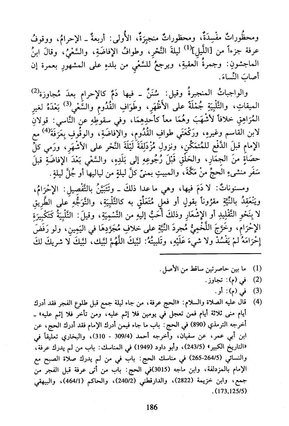 وَمَحْظُورَاتٌ مُفْسِدَةٌ، وَمَحْظُورَاتٌ مُنْجَبِرَةٌ، الأُولَى: أَرْبَعَةٌ - الإِحْرَامُ، وَوُقُوفُ عَرَفَةَ جُزْءاً مِنْ [اللَّيْلِ] لَيْلَةَ النَّحْرِ، وَطَوَافُ الإِفَاضَةِ، وَالسَّعْيُ، وَقَالَ ابْنُ الْمَاجِشُونِ: وَجَمْرَةُ الْعَقَبَةِ، وَيَرْجِعُ لِلسَّعْيِ مِنْ بَلَدِهِ عَلَى الْمَشْهُورِ بِعُمْرَةٍ إِنْ أَصَابَ النِّسَاءَ.