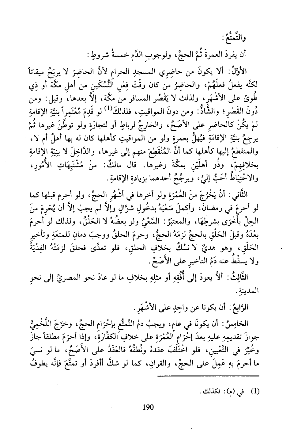 أَنْ يُفْرِدَ الْعُمْرَةَ ثُمَّ الْحَجَّ، وَلِوُجُوبِ الدَّمِ خَمْسَةُ شُرُوطٍ: