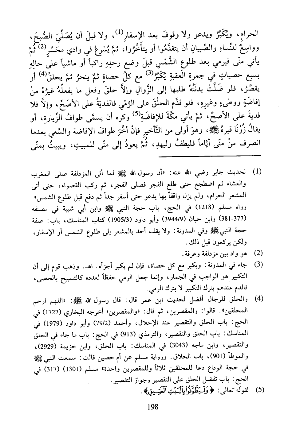 الْحَرَامِ، وَيُكَبِّرُ وَيَدْعُو وَلا وُقُوفَ بَعْدَ الإِسْفَارِ، وَلا قَبْلَ أَنْ يُصَلِّيَ الصُّبْحَ، وَوَاسِعٌ لِلنِّسَاءِ وَالصِّبْيَانِ أَنْ يَتَقَدَّمُوا أَوْ يَتَأَخَّرُوا، ثُمَّ يُسْرِعُ فِي وَادِي مُحَسِّرٍ ثُمَّ يَأْتِي مِنًى فَيَرْمِي بَعْدَ طُلُوعِ الشَّمْسِ قَبْلَ وَضْعِ رَحْلِهِ رَاكِباً أَوْ مَاشِياً عَلَى حَالِهِ بِسَبْعِ حَصَيَاتٍ فِي جَمْرَةِ الْعَقَبَةِ يُكَبِّرُ مَعَ كُلِّ حَصَاةٍ ثُمَّ يَنْحَرُ ثُمَّ يَحْلِقُ أَوْ يُقَصِّرُ، فَلَوْ ضَلَّتْ بَدَنَتُهُ طَلَبَهَا إِلَى الزَّوَالِ وَإِلا حَلَقَ وَفَعَلَ مَا يَفْعَلُهُ غَيْرُهُ مِنْ إِفَاضَةٍ وَوَطْءٍ وَغَيْرِهِ، فَلَوْ قَدَّمَ الْحَلْقَ عَلَى الرَّمْيِ فَالْفِدْيَةُ عَلَى الأَصَحِّ، وَإِلا فَلا فِدْيَةَ عَلَى الأَصَحِّ، ثُمَّ يَأْتِي مَكَّةَ لِلإِفَاضَةِ وَكُرِهَ أَنْ يُسَمَّى طَوَافُ الزِّيَارَةِ، أَوْ يُقَالَ: زُرْنَا قَبْرَهُ صَلَّى اللَّهُ عَلَيْهِ وَسَلَّمَ، وَهُوَ أَوْلَى مِنَ التَّأْخِيرِ فَإِنْ أَخَّرَ طَوَافَ الإِفَاضَةِ وَالسَّعْيَ بَعْدَمَا انْصَرَفَ مِنْ مِنًى أَيَّاماً فَلْيَطُفْ وَلْيُهْدِ، ثُمَّ يَعُودُ إِلَى مِنًى لِلْمَبِيتِ، وَيَبِيتُ بِمِنًى