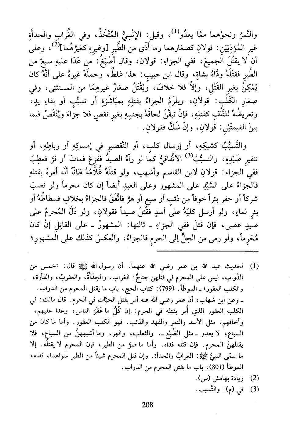 وَالنَّمِرُ وَنَحْوُهُمَا مِمَّا يَعْدُو، وَقِيلَ: الإِنْسِيُّ الْمُتَّخَذُ، وَفِي الْغُرَابِ وَالْحِدْأَةِ غَيْرِ الْمُؤْذِيَيْنِ: قَوْلانِ كَصِغَارِهِمَا وَمَا آذَى مِنَ الطَّيْرِ [وَغَيْرِهِ كَغَيْرِهِمَا]، وَعَلَى أَنْ لا يَقْتُلَ الْجَمِيعَ، فَفِي الْجَزَاءِ: قَوْلانِ، وَقَالَ أَصْبَغُ: مَنْ عَدَا عَلَيْهِ سَبُعٌ مِنَ الطَّيْرِ فَقَتَلَهُ وَدَاهُ بِشَاةٍ، وَقَالَ ابْنُ حَبِيبٍ: هَذَا غَلَطٌ، وَحَمَلَهُ غَيْرُهُ عَلَى أَنَّهُ كَانَ يُمْكِنُ بِغَيْرِ الْقَتْلِ، وَإلا فَلا خِلافَ، وَيُقْتَلُ صِغَارُ غَيْرِهِمَا مِنَ الْمُسْتَثْنَى، وَفِي صِغَارِ الْكَلْبِ: قَوْلانِ، وَيَلْزَمُ الْجَزَاءُ بِقَتْلِهِ بِمُبَاشَرَةٍ أَوْ تَسَبُّبٍ أَوْ بَقَاءِ يَدٍ، وَتَعْرِيضُهُ لِلتَّلَفِ