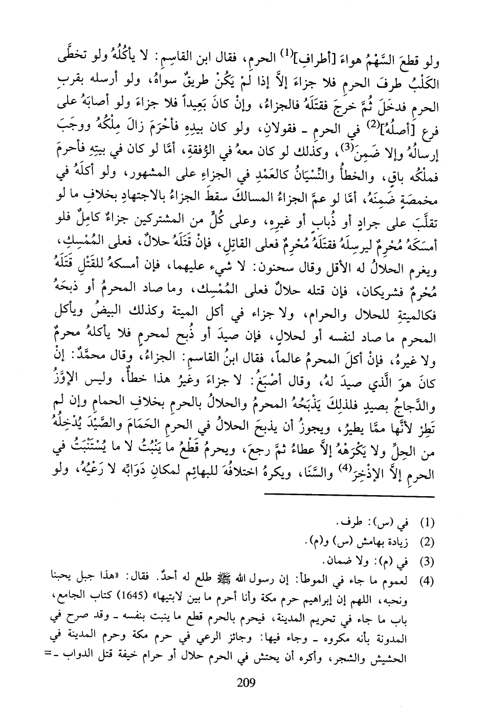 وَلَوْ قَطَعَ السَّهْمُ هَوَاءَ أَطْرَافِ الْحَرَمِ، فَقَالَ ابْنُ الْقَاسِمِ: لا يَأْكُلُهُ وَلَوْ تَخَطَّى الْكَلْبُ طَرَفَ الْحَرَمِ فَلا جَزَاءَ إِلا إِذَا لَمْ يَكُنْ طَرِيقٌ سِوَاهُ، وَلَوْ أَرْسَلَهُ بِقُرْبِ الْحَرَمِ فَدَخَلَ ثُمَّ خَرَجَ فَقَتَلَهُ فَالْجَزَاءُ، وَإِنْ كَانَ بَعِيداً فَلا جَزَاءَ وَلَوْ أَصَابَهُ عَلَى فَرْعٍ [أَصْلُهُ] فِي الْحَرَمِ - فَقَوْلانِ، وَلَوْ كَانَ بِيَدِهِ فَأَحْرَمَ زَالَ مِلْكُهُ وَوَجَبَ إِرْسَالُهُ وَإِلا ضَمِنَ (¬1)،