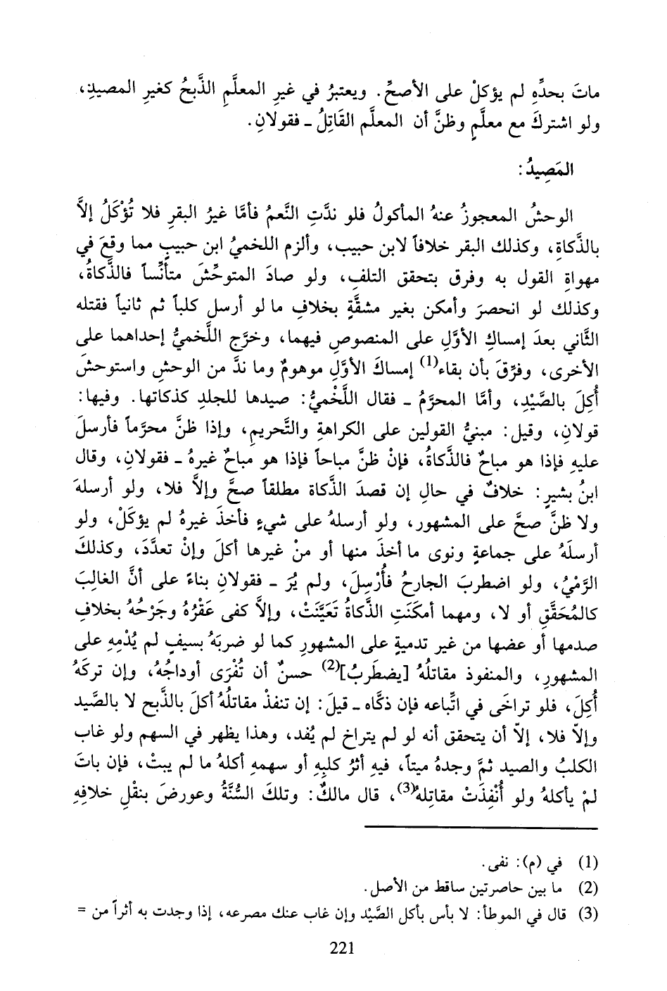 وَفِيهَا: قَوْلانِ، وَقِيلَ: مَبْنِيُّ الْقَوْلَيْنِ عَلَى الْكَرَاهَةِ وَالتَّحْرِيمِ، وَإِذَا ظَنَّ مُحَرَّماً فَأَرْسَلَ عَلَيْهِ فَإِذَا هُوَ مُبَاحٌ فَالذَّكَاةُ، فَإِنْ ظَنَّ مُبَاحاً فَإِذَا هُوَ مُبَاحٌ غَيْرُهُ - فَقَوْلانِ، وَقَالَ ابْنُ بَشِيرٍ: خِلافٌ فِي حَالِ إِنْ قَصَدَ الذَّكَاةَ مُطْلَقاً صَحَّ وَإِلا فَلا، وَلَوْ أَرْسَلَهُ وَلا ظَنَّ صَحَّ عَلَى الْمَشْهُورِ، وَلَوْ أَرْسَلَهُ عَلَى شَيْءٍ فَأَخَذَ غَيْرَهُ لَمْ يُؤْكَلْ، وَلَوْ أَرْسَلَهُ عَلَى جَمَاعَةٍ وَنَوَى مَا أَخَذَ مِنْهَا أَوْ مِنْ غَيْرِهَا أَكَلَ وَإِنْ تَعَدَّدَ، وَكَذَلِكَ الرَّمْيُ، وَلَوِ اضْطَرَبَ الْجَارِحُ فَأُرْسِلَ، وَلَمْ يُرَ - فَقَوْلانِ بِنَاءً عَلَى أَنَّ الْغَالِبَ كَالْمُحَقَّقِ أَوْ لا، وَمَهْمَا أَمْكَنَتِ الذَّكَاةُ تَعَيَّنَتْ، وَإِلا كَفَى عَقْرُهُ وَجَرْحُهُ بِخِلافِ صَدْمِهَا أَوْ عَضِّهَا مِنْ غَيْر تَدْمِيَةٍ عَلَى الْمَشْهُورِ كَمَا لَوْ ضَرَبَهُ بِسَيْفٍ لَمْ يُدْمِهِ عَلَى الْمَشْهُورِ، وَالْمَنْفُوذُ مَقَاتِلُهُ [يَضْطَرِبُ] حَسَنٌ أَنْ تُفْرَى أَوْدَاجُهُ، وَإِنْ تَرَكَهُ أُكِلَ، فَلَوْ تَرَاخَى فِي اتِّبَاعِهِ فَإِنْ ذَكَّاهُ - قِيلَ: إِنْ تَنْفُذْ مَقَاتِلُهُ أُكِلَ بِالذَّبْحِ لا بِالصَّيْدِ وَإِلا فَلا، إِلا أَنْ يَتَحَقَّقَ أَنَّهُ لَوْ لَمْ يَتَرَاخَ لَمْ يُفِدْ، وَهَذَا يَظْهَرُ فِي السَّهْمِ وَلَوْ غَابَ الْكَلْبُ وَالصَّيْدُ ثُمَّ وَجَدَهُ مَيِّتاً، فِيهِ أَثَرُ كَلْبِهِ أَوْ سَهْمِهِ أَكَلَهُ مَا لَمْ يَبِتَّ، فَإِنْ بَاتَ لَمْ يَأْكُلْهُ وَلَوْ أُنْفِذَتْ مَقَاتِلُهُ، قَالَ مَالِكٌ: وَتِلْكَ السُّنَّةُ وَعُورِضَ بِنَقْلِ خِلافِهِ