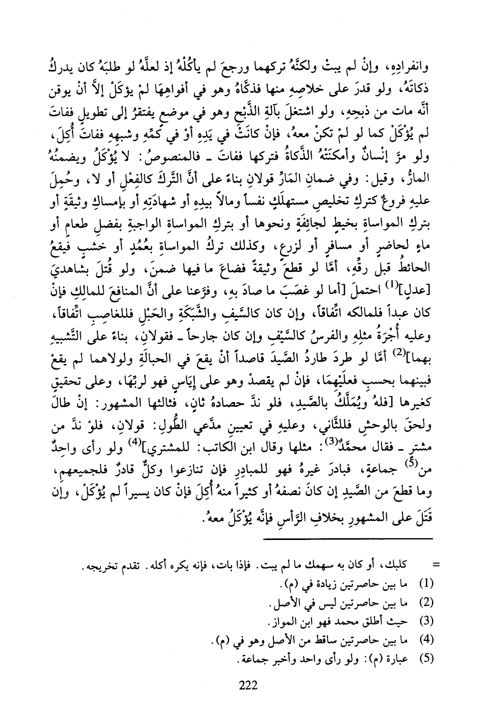 تَرَكَهُمَا وَرَجَعَ لَمْ يَأَكُلْهُ إِذْ لَعَلَّهُ لَوْ طَلَبَهُ كَانَ يُدْرِكُ ذَكَاءَهُ، وَلَوْ قَدَرَ عَلَى خَلاصِهِ مِنْهَا فَذَكَّاهُ وَهُوَ فِي أَفْوَاهِهَا لَمْ يُؤْكَلْ إِلا أَنْ يُوقِنَ أَنَّهُ مَاتَ مِنْ ذَبْحِهِ، وَلَوِ اشْتَغَلَ بِآلَةِ الذَّبْحِ وَهُوَ فِي مَوْضِعٍ يَفْتَقِرُ إِلَى تَطْوِيلٍ فَفَاتَ لَمْ يُؤْكَلْ كَمَا لَوْ لَمْ تَكُنْ مَعَهُ، فَإِنْ كَانَتْ فِي يَدِهِ أَوْ فِي كُمِّهِ وَشِبْهِهِ فَفَاتَ أُكِلَ، وَلَوْ مَرَّ إِنْسَانٌ وَأَمْكَنَتْهُ الذَّكَاةُ فَتَرَكَهَا فَفَاتَ - فَالْمَنْصُوصُ: لا يُؤْكَلُ وَيَضْمَنُهُ الْمَارُّ، وَقِيلَ: وَفِي ضَمَانِ الْمَارِّ قَوْلانِ بِنَاءً عَلَى أَنَّ التَّرْكَ كَالْفِعْلِ أَوْ لا، وَحُمِلَ عَلَيْهِ فُرُوعٌ كَتَرْكِ تَخْلِيصِ مُسْتَهْلِكٍ نَفْساً وَمَالاً بِيَدِهِ أَوْ شَهَادَتِهِ أَوْ بِإِمْسَاكِ وَثَيِقَةٍ أَوْ بِتَرْكِ الْمُوَاسَاةِ بِخَيْطٍ لِجَائِفَةٍ وَنَحْوِهَا أَوْ بِتَرْكِ الْمُوَاسَاةِ الْوَاجِبَةِ بِفَضْلِ طَعَامٍ أَوْ مَاءٍ لِحَاضِرٍ أَوْ مُسَافِرٍ أَوْ لِزَرْعٍ، وَكَذَلِكَ تَرْكُ الْمُوَاسَاةِ بِعُمُدٍ أَوْ خَشَبٍ فَيَقَعُ الْحَائِطُ قَبْلَ رِقِّهِ، أَمَّا لَوْ قَطَعَ وَثِيقَةً فَضَاعَ مَا فِيهَا ضَمِنَ، وَلَوْ قُتِلَ بِشَاهِدَيْ [عَدْلٍ] احْتَمَلَ [أَمَّا لَوْ غَصَبَ مَا صَادَ بِهِ، وَفَرَّعْنَا عَلَى أَنَّ الْمَنَافِعَ لِلْمَالِكِ فَإِنْ كَانَ عَبْداً فَلِمَالِكِهِ اتِّفَاقاً، وَإِنْ كَانَ كَالسَّيْفِ وَالشَّبَكَةِ وَالْحَبْلِ فَلِلْغَاصِبِ اتِّفَاقاً، وَعَلَيْهِ أُجْرَةُ مِثْلِهِ وَالْفَرَسُ كَالسَّيْفِ وَإِنْ كَانَ جَارِحاً - فَقَوْلانِ، بِنَاءً عَلَى التَّشْبِيهِ بِهِمَا] أَمَّا لَوْ طَرَدَ طَارِدٌ الصَّيْدَ قَاصِداً أَنْ يَقَعَ فِي الْحِبَالَةِ