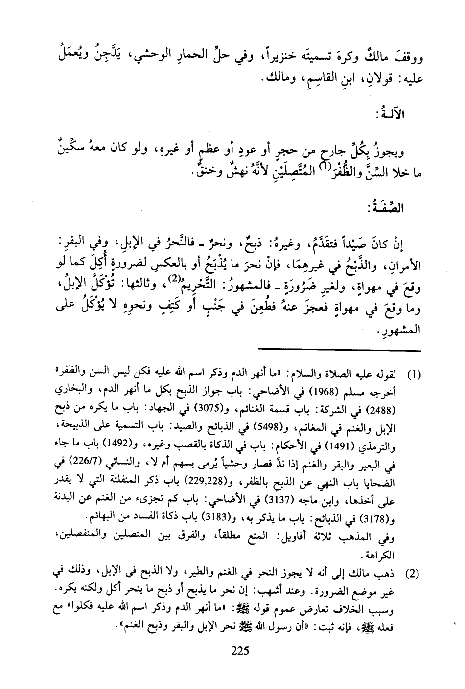 إِنْ كَانَ صَيْداً فَتَقَدَّمَ، وَغَيْرُهُ: ذَبْحٌ، وَنَحْرٌ - فَالنَّحْرُ فِي الإِبِلِ، وَفِي الْبَقَرِ: الأَمْرَانِ، وَالذَّبْحُ فِي غَيْرِهِمَا، فَإِنْ نَحَرَ مَا يُذْبَحُ أَوْ بِالْعَكْسِ لِضَرُورَةٍ أُكِلَ كَمَا لَوْ وَقَعَ فِي مَهْوَاةٍ، وَلِغَيْرِ ضَرَورَةٍ - فَالْمَشْهُورُ: التَّحْرِيمُ، وَثَالِثُهَا: تُؤْكَلُ الإِبِلُ، وَما وَقَعَ فِي مَهْوَاةٍ فَعَجَزَ عَنْهُ فَطُعِنَ فِي جَنْبٍ أَوْ كَتِفٍ وَنَحْوِهِ لا يُؤْكَلُ عَلَى الْمَشْهُورِ.