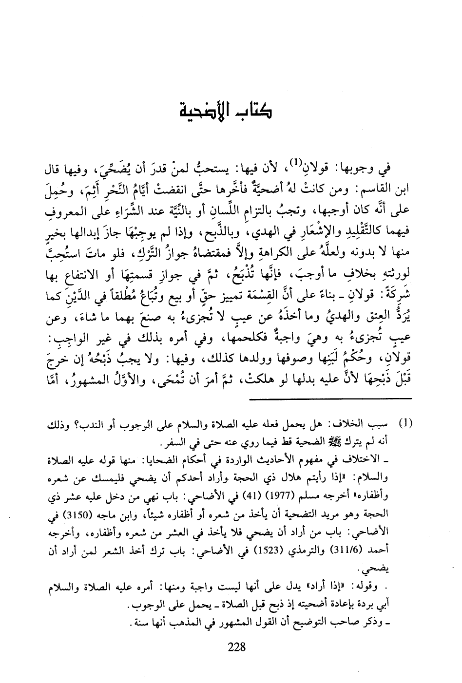 فِي وُجُوبِهَا: قَوْلانِ، لأَنَّ فِيهَا: يُسْتَحَبُّ لِمَنْ قَدَرَ أَنْ يُضَحِّيَ، وَفِيهَا قَالَ ابْنُ الْقَاسِمِ: وَمَنْ كَانَتْ لَهُ أُضْحِيَّةٌ فَأَخَّرَهَا حَتَّى انْقَضَتْ أَيَّامُ النَّحْرِ أَثِمَ، وَحُمِلَ عَلَى أَنَّهُ كَانَ أَوْجَبَهَا، وَتَجِبُ بِالْتِزَامِ اللِّسَانِ أَوْ بِالنِّيَّةِ عِنْدَ الشِّرَاءِ عَلَى الْمَعْرُوفِ فِيهِمَا كَالتَّقْلِيدِ وَالإِشْعَارِ فِي الْهَدْيِ، وَبِالذَّبْحِ، وَإِذَا لَمْ يُوجِبْهَا جَازَ إِبْدَالُهَا بِخَيْرٍ مِنْهَا لا بِدُونِهِ وَلَعَلَّهُ عَلَى الْكَرَاهَةِ وَإِلا فَمُقْتَضَاهُ جَوَازُ التَّرْكِ، فَلَوْ مَاتَ اسْتُحِبَّ لِوَرَثَتِهِ بِخِلافِ مَا أَوْجَبَ، فَإِنَّهَا تُذْبَحُ، ثُمَّ فِي جَوَازِ قِسْمَتِهَا أَوِ الانْتِفَاعِ بِهَا شَرِكَةً: قَوْلانِ-بِنَاءً عَلَى أَنَّ الْقِسْمَةَ تَمْيِيزُ حَقٍّ أَوْ بَيْعٍ وَتُبَاعُ مُطْلَقاً فِي الدَّيْنِ كَمَا يُرَدُّ الْعِتْقُ وَالْهَدْيُ وَما أَخَذَهُ عَنْ عَيْبٍ لا تُجْزِئُ بِهِ صَنَعَ بِهِمَا مَا شَاءَ، وَعَنْ عَيْبٍ تُجْزِئُ بِهِ وَهِيَ وَاجِبَةٌ فَكَلَحْمِهَا، وَفِي أَمْرِهِ بِذَلِكَ فِي غَيْرِ الْوَاجِبِ: قَوْلانِ، وَحُكْمُ لَبَنِهَا وَصُوفِهَا وَوَلَدِهَا كَذَلِكَ، وَفِيهَا: وَلا يَجِبُ ذَبْحُهُ إِنْ خَرَجَ قَبْلَ ذَبْحِهَا لأَنَّ عَلَيْهِ بَدَلَهَا لَوْ هَلَكَتْ، ثُمَّ أَمَرَ أَنْ تُمْحَى، وَالأَوَّلُ الْمَشْهُورُ، أَمَّا