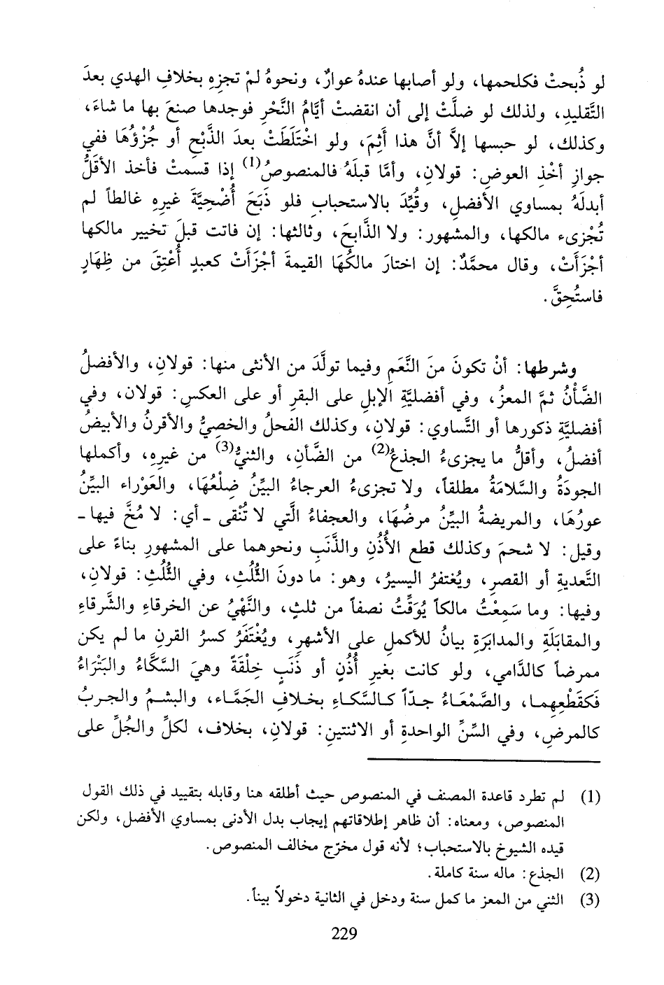 وَشَرْطُهُا: أَنْ تَكُونَ مِنَ النَّعَمِ وَفِيمَا تَوَلَّدَ مِنَ الأُنْثَى مِنْهَا: قَوْلانِ، وَالأَفْضَلُ الضَّأْنُ ثُمَّ الْمَعَزُ، وَفِي أَفْضَلِيَّةِ الإِبِلِ عَلَى الْبَقَرِ أَوْ عَلَى الْعَكْسِ: قَوْلانِ، وَفِي أَفْضَلِيَّةِ ذُكُورِهَا أَوِ التَّسَاوِي: قَوْلانِ، وَكَذَلِكَ الْفَحْلُ وَالْخَصِيُّ وَالأْقَرَنُ وَالأَبْيَضُ أَفْضَلُ، وَأَقَلُّ مَا يُجْزِئُ الْجَذَعُ مِنَ الضَّأْنِ، وَالثَّنِيُّ مِنْ غَيْرِهِ، وَأَكْمَلُهَا الْجَوْدَةُ وَالسَّلامَةُ مُطْلَقاً، وَلا تُجْزِئُ الْعَرْجَاءُ الْبَيِّنُ ضِلْعُهَا، وَالْعَوْرَاءُ الْبَيِّنُ عَوَرُهَا، وَالْمَرِيضَةُ الْبَيِّنُ مَرَضُهَا، وَالْعَجْفَاءُ الَّتِي لا تُنْقَى - أَيْ: لا مُخَّ فِيهَا - وَقِيلَ: لا شَحْمَ وَكَذَلِكَ قَطْعُ الأُذُنِ وَالذَّنَبِ وَنَحْوِهِمَا عَلَى الْمَشْهُورِ بِنَاءً عَلَى التَّعْدِيَةِ أَوِ الْقَصْرِ، وَيُغْتَفَرُ الْيَسِيرُ، وَهُوَ: مَا دُونَ الثُّلُثِ، وَفِي الثُّلُثِ: قَوْلانِ، وَفِيهَا: وَما سَمِعْتُ مَالِكاً يُوَقِّتُ نِصْفاً مِنْ ثُلُثٍ، وَالنَّهْيُ عَنِ الْخَرْقَاءِ وَالشَّرْقَاءِ وَالْمُقَابَلَةِ وَالْمُدَابَرَةِ بَيَانٌ لِلأَكْمَلِ عَلَى الأَشْهَرِ، وَيُغْتَفَرُ كَسْرُ الْقَرْنِ مَا لَمْ يَكُنْ مُمْرِضاً كَالدَّامِي، وَلَوْ كَانَتْ بِغَيْرِ أُذُنٍ أَوْ ذَنَبٍ خِلْقَةً وَهِيَ السَّكَّاءُ وَالْبَتْرَاءُ فَكَقَطْعِهِمَا، وَالصَّمْعَاءُ جِدّاً كَالسَّكَّاءِ بِخِلافِ الْجَمَّاءِ، وَالْبَشَمُ وَالْجَرَبُ كَالْمَرَضِ، وَفى السِّنِّ الْوَاحِدَةِ أَوِ الاثْنَتَيْنِ: قَوْلانِ، بِخِلافٍ، لِكُلٍّ وَالْجُلُّ عَلَى