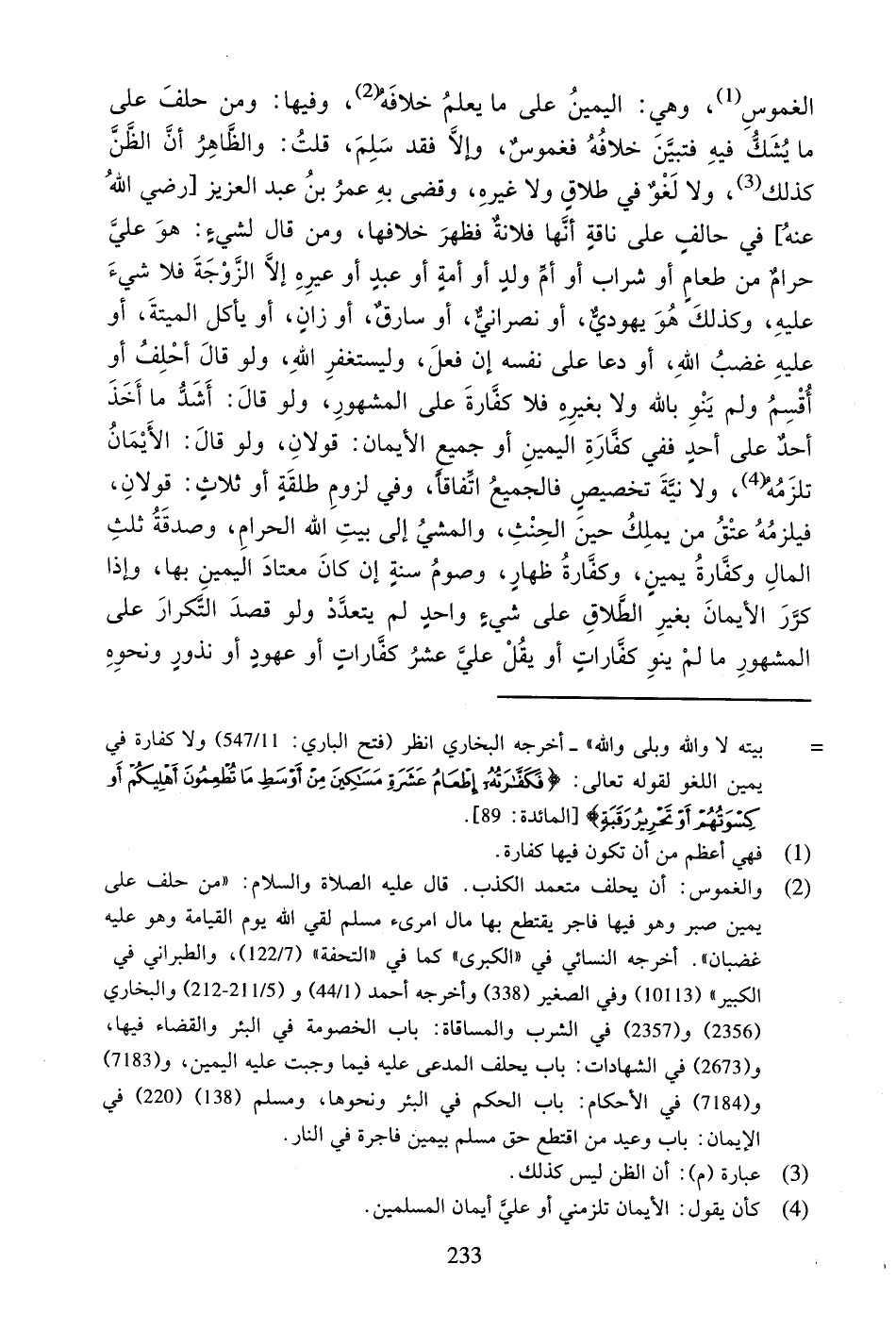 وَلا لَغْوَ فِي طَلاقٍ وَلا غَيْرِهِ، وَقَضَى بِهِ عُمَرُ بْنُ عَبْدِ الْعَزِيزِ [رَضِيَ اللَّهُ عَنْهُ] فِي حَالِفٍ عَلَى نَاقَةٍ أَنَّهَا فُلانَةُ فَظَهَرَ خِلافُهَا، وَمَنْ قَالَ لِشَيْءٍ: هُوَ عَلَيَّ حَرَامٌ مِنْ طَعَامٍ أَوْ شَرَابٍ أَوْ أُمِّ وَلَدٍ أَوْ أَمَةٍ أَوْ عَبْدٍ أَوْ عِيرِهِ إِلا الزَّوْجَةَ فَلا شَيْءَ عَلَيْهِ، وَكَذَلِكَ هُوَ يَهُودِيٌّ، أَوْ نَصْرَانِيٌّ، أَوْ سَارِقٌ، أَوْ زَانٍ، أَوْ يَأْكُلُ الْمَيْتَةَ، أَوْ عَلَيْهِ غَضَبُ اللَّهِ، أَوْ دَعَا عَلَى نَفْسِهِ إِنْ فَعَلَ، وَلْيَسْتَغْفِرِ اللَّهَ، وَلَوْ قَالَ: أَحْلِفُ أَوْ أُقْسِمُ وَلَمْ يَنْوِ بِاللَّهِ وَلا بِغَيْرِهِ فَلا كَفَّارَةَ عَلَى الْمَشْهُورِ، وَلَوْ قَالَ: أَشَدُّ مَا أَخَذَ أَحَدٌ عَلَى أَحَدٍ فَفِي كَفَّارَةِ الْيَمِينِ أَوْ جَمِيعِ الأَيْمَانِ: قَوْلانِ، وَلَوْ قَالَ: الأَيْمَانُ تَلْزَمُهُ، وَلا نِيَّةَ تَخْصِيصٍ فَالْجَمِيعُ اتِّفَاقاً، وَفِي لُزُومِ طَلْقَةٍ أَوْ ثَلاثٍ: قَوْلانِ، فَيَلْزَمُهُ عِتْقُ مَنْ يَمْلِكُ حِينَ الْحِنْثِ، وَالْمَشْيُ إِلَى بَيْتِ اللَّهِ الْحَرَامِ، وَصَدَقَةُ ثُلُثِ الْمَالِ وَكَفَّارَةُ يَمِينٍ، وَكَفَّارَةُ ظِهَارٍ، وَصَوْمُ سَنَةٍ إِنْ كَانَ مُعْتَادَ الْيَمِينِ بِهَا، وَإِذَا كَرَّرَ الأَيْمَانَ بِغَيْرِ الطَّلاقِ عَلَى شَيْءٍ وَاحِدٍ لَمْ يَتَعَدَّدْ وَلَوْ قَصَدَ التَّكْرَارَ عَلَى الْمَشْهُورِ مَا لَمْ يَنْوِ كَفَّارَاتٍ أَوْ يَقُلْ: عَلَيَّ عَشْرُ كَفَّارَاتٍ أَوْ عُهُودٍ أَوْ نُذُورٍ وَنَحْوِهِ