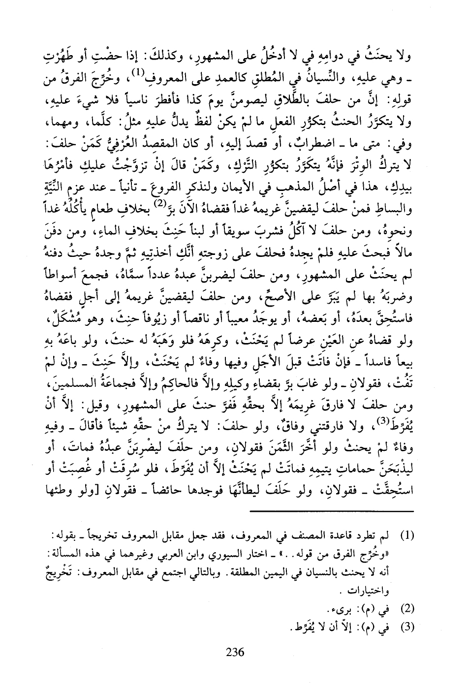 وَلا يَحْنَثُ فِي دَوَامِهِ فِي لا أَدْخُلُ عَلَى الْمَشْهُورِ، وَكَذَلِكَ: إِذَا حِضْتِ أَوْ طَهُرْتِ - وَهِيَ عَلَيْهِ، وَالْمُطَلِّقُ كَالْعَمْدِ عَلَى الْمَعْرُوفِ، وَخُرِّجَ الْفَرْقُ مِنْ قَوْلِهِ: إِنَّ مَنْ حَلَفَ بِالطَّلاقِ لَيَصُومَنَّ يَوْمَ كَذَا فَأَفْطَرَ نَاسِياً فَلا شَيْءَ عَلَيْهِ، وَلا يَتَكَرَّرُ الْحِنْثُ بِتَكَرُّرِ الْفِعْلِ مَا لَمْ يَكُنْ لَفْظٌ يَدُلُّ مِثْلُ: كُلَّمَا، وَمَهْمَا، وَفي: مَتَى مَا - اضْطِرَابٌ، أَوْ قَصَدَ إِلَيْهِ، أَوْ كَانَ الْمَقْصِدُ الْعُرْفِيُّ كَمَنْ حَلَفَ: لا يَتْرُكُ الْوِتْرَ فَإِنَّهُ يَتَكَرَّرُ بِتَكَرُّرِ التَّرْكِ، وَكَمَنْ قَالَ: إِنْ تَزَوَّجْتُ عَلَيْكِ فَأَمْرُهَا بِيَدِكِ، هَذَا فِي أَصْلِ الْمَذْهَبِ فِي الأَيْمَانِ وَلْنَذْكُرِ الْفُرُوعَ - تَأَنِّياً - عِنْدَ عَزْمِ النِّيَّةِ وَالْبِسَاطِ فَمَنْ حَلَفَ لَيَقْضِيَنَّ غَرِيمَهُ غَداً فَقَضَاهُ الآنَ بَرَّ (¬1)