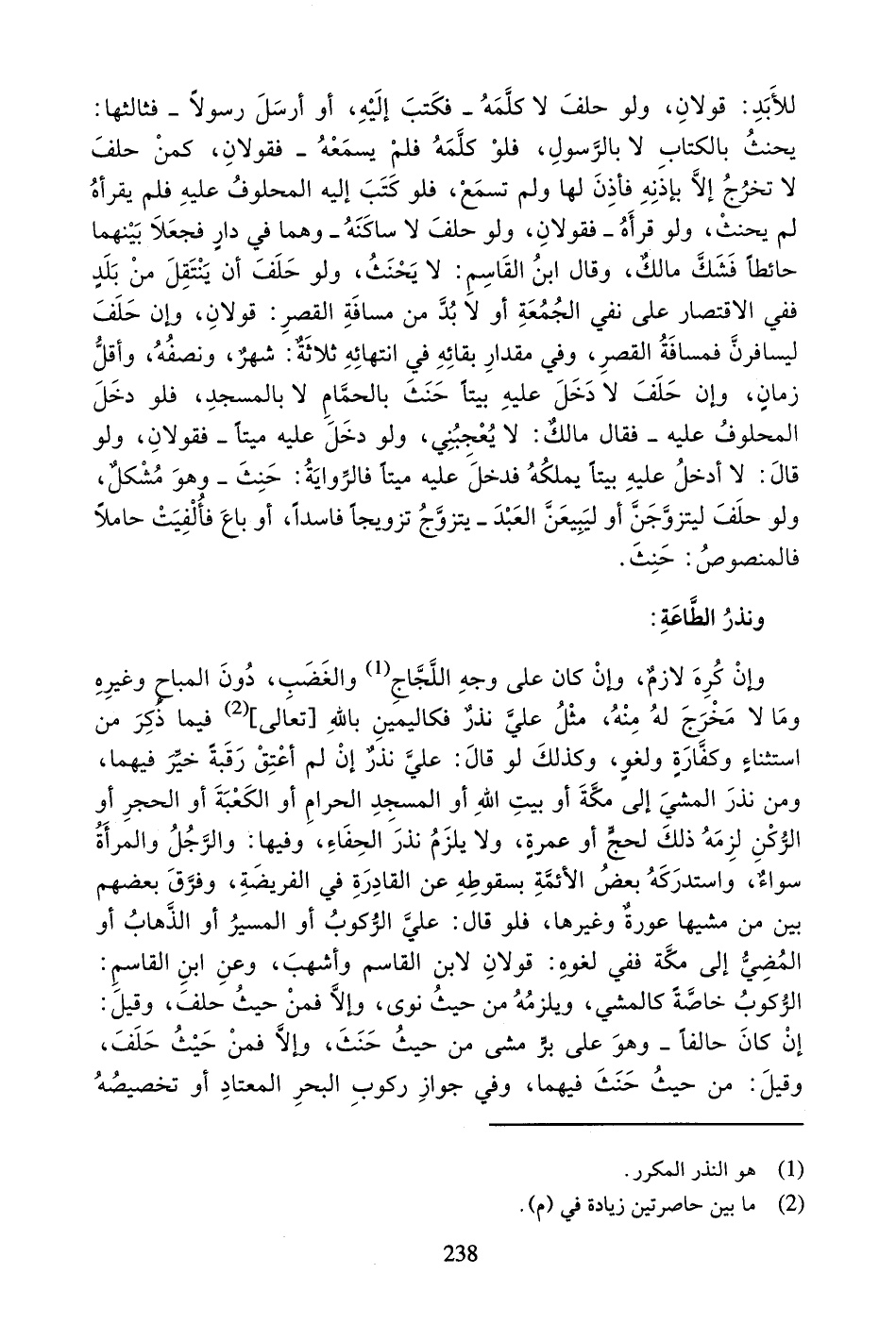 وَإِنْ كُرِهَ لازِمٌ، وَإِنْ كَانَ عَلَى وَجْهِ اللَّجَاجِ وَالْغَضَبِ، دُونَ الْمُبَاحِ وَغَيْرِهِ وَمَا لا مَخْرَجَ لَهُ مِنْهُ، مِثْلُ عَلَيَّ نَذْرٌ فَكَالْيَمِينِ بِاللَّهِ [تَعَالَى] فِيمَا ذَكَرَ مِنِ اسْتِثْنَاءٍ وَكَفَّارَةٍ وَلَغْوٍ، وَكَذَلِكَ لَوْ قَالَ: عَلَيَّ نَذْرٌ إِنْ لَمْ أُعْتِقْ رَقَبَةً خُيِّرَ فِيهِمَا، وَمَنْ نَذَرَ الْمَشْيَ إِلَى مَكَّةَ أَوْ بَيْتِ اللَّهِ أَوِ الْمَسْجِدِ الْحَرَامِ أَوِ الْكَعْبَةِ أَوِ الْحَجَرِ أَوِ الرُّكْنِ لَزِمَهُ ذَلِكَ لِحِجٍّ أَوْ عُمْرَةٍ، وَلا يَلْزَمُ نَذْرُ الْحَفَاءِ، وَفِيهَا: وَالرَّجُلُ وَالْمَرْأَةُ سَوَاءٌ، وَاسْتَدْرَكَهُ بَعْضُ الأَئِمَّةِ بِسُقُوطِهِ عَنِ الْقَادِرَةِ فِي الْفَرِيضَةِ، وَفَرَّقَ بَعْضُهُمْ بَيْنَ مَشْيِهَا عَوْرَةً وَغَيْرِهَا، فَلَوْ قَالَ: عَلَيَّ الرُّكُوبُ أَوِ الْمَسِيرُ أَوِ الذِّهَابُ أَوِ الْمُضِيُّ إِلَى مَكَّةَ فَفِي لَغْوِهِ: قَوْلانِ لابْنِ الْقَاسِمِ وَأَشْهَبَ، وَعَنِ ابْنِ الْقَاسِمِ: الرُّكُوبُ خَاصَّةً كَالْمَشْيِ، وَيَلْزَمُهُ مِنْ حَيْثُ نَوَى، وَإِلا فَمِنْ حَيْثُ حَلَفَ، وَقِيلَ: إِنْ كَانَ حَالِفاً - وَهُوَ عَلَى بَرٍّ مَشَى مِنْ حَيْثُ حَنِثَ، وَإِلا فَمِنْ حَيْثُ حَلَفَ، وَقِيلَ: مِنْ حَيْثُ حَنِثَ فِيهِمَا، وَفِي جَوَازِ رُكُوبِ الْبَحْرِ الْمُعْتَادِ أَوْ تَخْصِيصِهِ