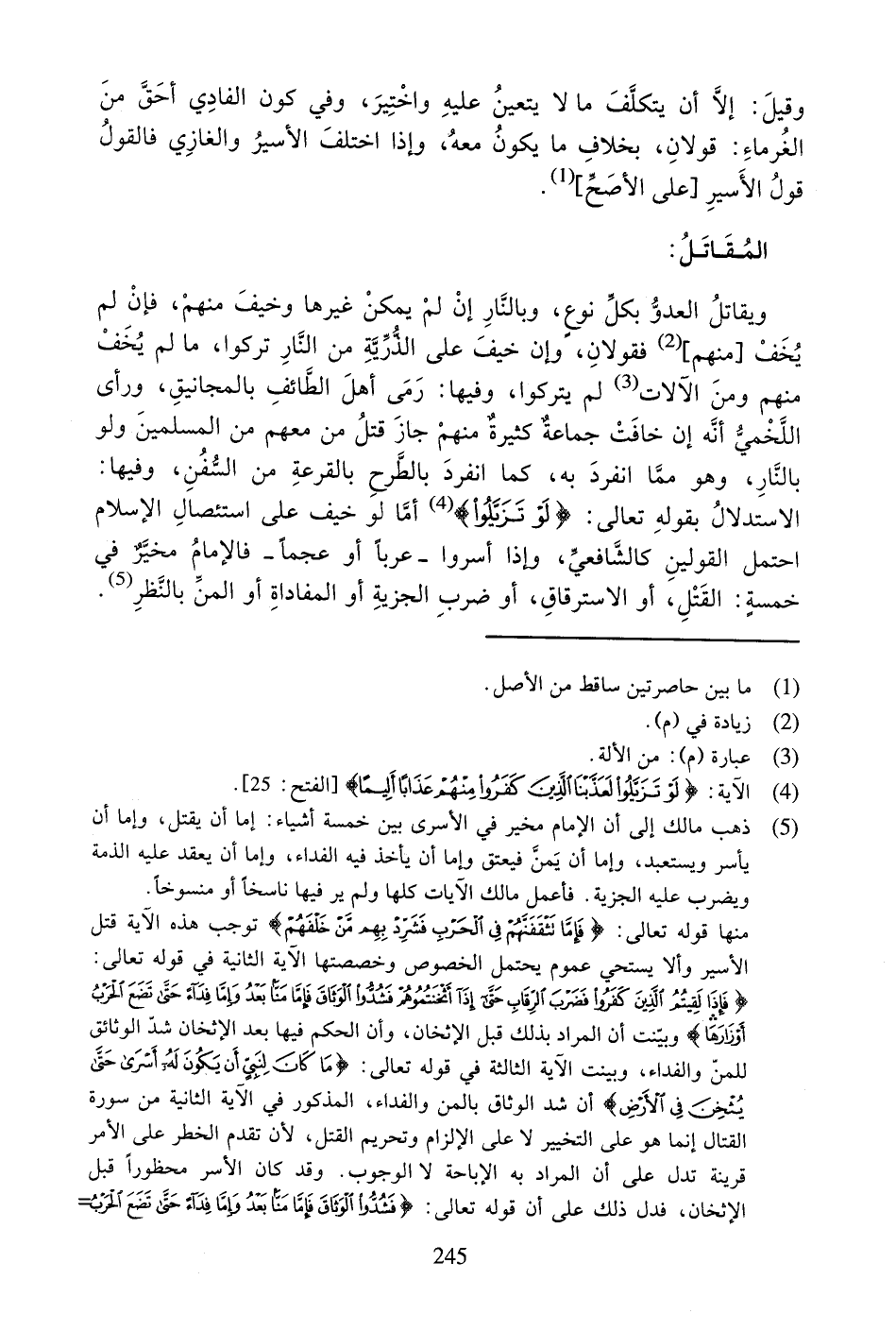 وَيُقَاتَلُ الْعَدُوُّ بِكُلِّ نَوْعٍ، وَبِالنَّارِ إِنْ لَمْ يُمْكِنْ غَيْرُهَا وَخِيفَ مِنْهُمْ، فَإِنْ لَمْ يُخَفْ [مِنْهُمْ] فَقَوْلانِ، وَإِنْ خِيفَ عَلَى الذُّرِّيَّةِ مِنَ النَّارِ تُرِكُوا، مَا لَمْ يُخَفْ مِنْهُمْ وَمِنَ الآلاتِ (¬1) لَمْ يُتْرَكُوا، وَفِيهَا: رَمَى أَهْلَ الطَّائِفِ بِالْمَجَانِيقِ، وَرَأَى اللَّخْمِيُّ أَنَّهُ إِنْ خَافَتْ جَمَاعَةٌ كَثِيرَةٌ مِنْهُمْ جَازَ قَتْلُ مَنْ مَعَهُمْ مِنَ الْمُسْلِمِينَ وَلَوْ بِالنَّارِ، وَهُوَ مِمَّا انْفَرَدَ بِهِ، كَمَا انْفَرَدَ بِالطَّرْحِ بِالْقُرْعَةِ مِنَ السُّفُنِ، وَفِيهَا: الاسْتِدْلالُ بِقَوْلِهِ تَعَالَى: (لَوْ تَزَيَّلُوا) أَمَّا لَوْ خِيفَ عَلَى اسْتِئْصَالِ الإِسْلامِ احْتَمَلَ الْقَوْلَيْنِ كَالشَّافِعِيِّ، وَإِذَا أُسِرُوا - عُرْباً أَوْ عُجْماً - فَالإِمَامُ مُخَيَّرٌ فِي خَمْسَةٍ: الْقَتْلِ، أَوِ الاسْتِرْقَاقِ، أَوْ ضَرْبِ الْجِزْيَةِ أَوِ الْمُفَادَاةِ أَوِ الْمَنِّ بِالنَّظَرِ.