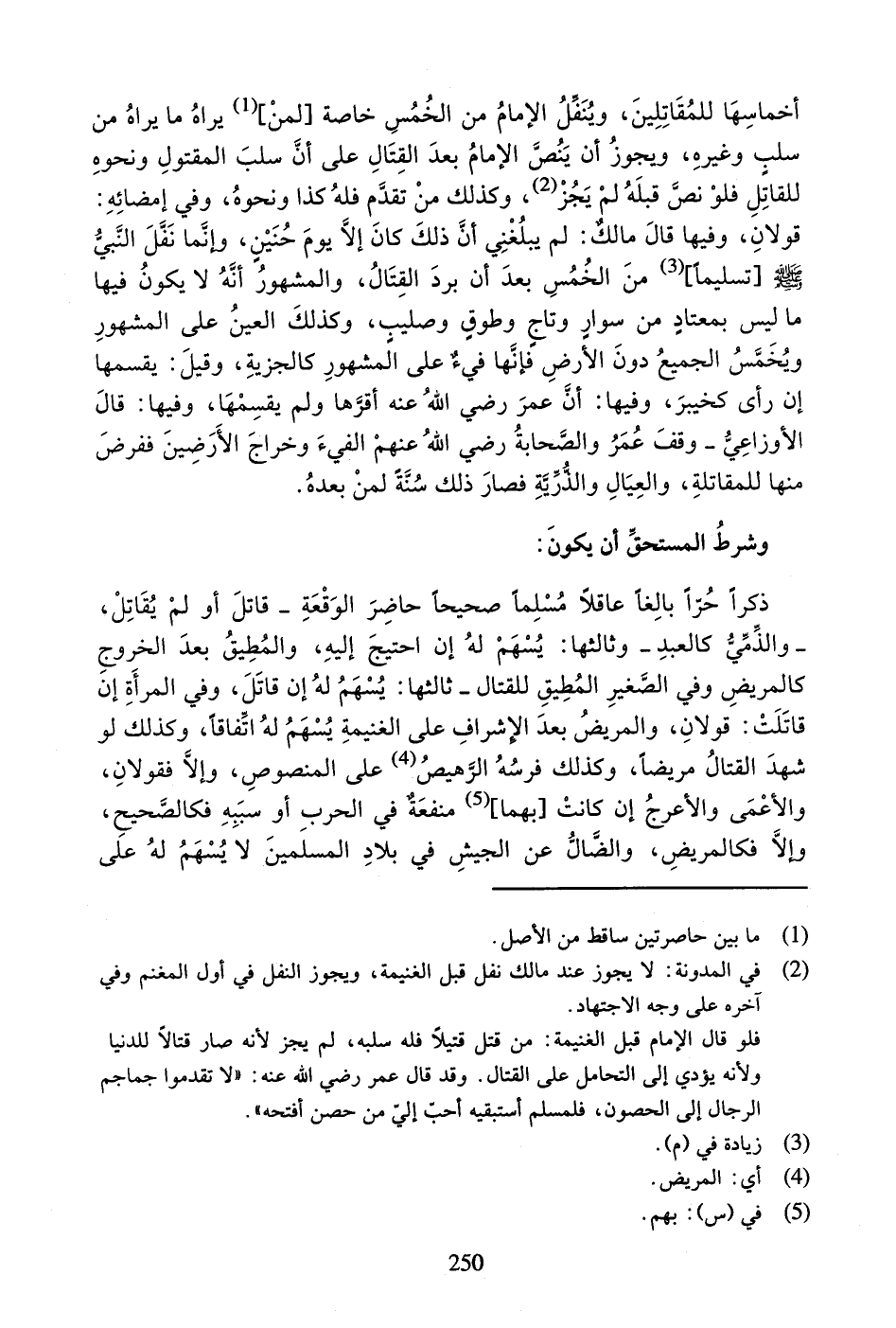 أَخْمَاسِهَا لِلْمُقَاتِلِينَ، وَيُنَفِّلُ الإِمَامُ مِنَ الْخُمُسِ خَاصَّةً [لِمَنْ] يَرَاهُ مَا يَرَاهُ مِنْ سَلَبٍ وَغَيْرِهِ، وَيَجُوزُ أَنْ يَنُصَّ الإِمَامُ بَعْدَ الْقِتَالِ عَلَى أَنَّ سَلَبَ الْمَقْتُولِ وَنَحْوِهِ لِلْقَاتِلِ فَلَوْ نَصَّ قَبْلَهُ لَمْ يَجُزْ، وَكَذَلِكَ مَنْ تَقَدَّمَ فَلَهُ كَذَا وَنَحْوُهُ، وَفِي إِمْضَائِهِ: قَوْلانِ، وَفيهَا قَالَ مَالِكٌ: لَمْ يَبْلُغْنِي أَنَّ ذَلِكَ كَانَ إِلا يَوْمَ حُنَيْنٍ، وَإِنَّمَا نَفَّلَ النَّبِيُّ صَلَّى اللَّهُ عَلَيْهِ وَسَلَّمَ [تَسْلِيماً] مِنَ الْخُمُسِ بَعْدَ أَنْ بَرَدَ الْقِتَالُ، وَالْمَشْهُورُ أَنَّهُ لا يَكُونُ فِيهَا مَا لَيْسَ بِمُعْتَادٍ مِنْ سِوَارٍ وَتاج ٍوَطَوْقٍ وَصَلِيبٍ، وَكَذَلِكَ الْعَيْنُ عَلَى الْمَشْهُورِ وَيُخَمَّسُ الْجَمِيعُ دُونَ الأَرْضِ فَإِنَّهَا فَيْءٌ عَلَى الْمَشْهُورِ كَالْجِزْيَةِ، وَقِيلَ: يَقْسِمُهَا إِنْ رَأَى كَخَيْبَرَ: وَفِيهَا: أَنَّ عُمَرَ رَضِيَ اللَّهُ عَنْهُ أَقَرَّهَا وَلَمْ يَقْسِمْهَا، وَفِيهَا: قَالَ الأَوْزَاعِيُّ - وَقَفَ عُمَرُ وَالصَّحَابَةُ رَضِيَ اللَّهُ عَنْهُمُ الْفَيْءَ وَخَرَاجَ الأَرَضِينَ فَفُرِضَ مِنْهَا