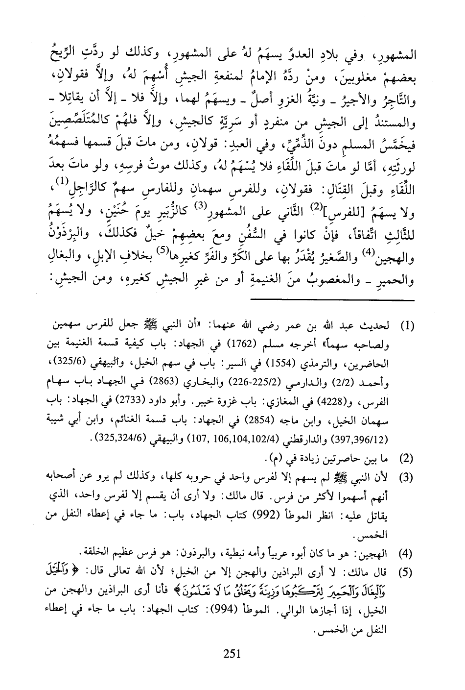 بَعْدَ اللِّقَاءِ وَقَبْلَ الْقِتَالِ: فَقَوْلانِ، وَلِلْفَرَسِ سَهْمَانِ وَلِلْفَارِسِ سَهْمٌ كَالرَّاجِلِ، وَلا يُسْهَمُ [لِلْفَرَسِ] الثَّانِي عَلَى الْمَشْهُورِ كَالزُّبَيْرِ يَوْمَ حُنَيْنٍ، وَلا يُسْهَمُ لِلثَّالِثِ اتِّفَاقاً، فَإِنْ كَانُوا فِي السُّفُنِ وَمَعَ بَعْضِهِمْ خَيْلٌ فَكَذَلِكَ، وَالْبِرْذَوْنُ وَالْهَجِينُ وَالصَّغِيرُ يَقْدِرُ بِهَا عَلَى الْكَرِّ وَالْفَرِّ كَغَيْرِهِا بِخِلافِ الإِبِلِ، وَالْبِغَالُ وَالْحَمِيرُ - وَالْمَغْصُوبُ مِنَ الْغَنِيمَةِ أَوْ مِنْ غَيْرِ الْجَيْشِ كَغَيْرِهِ، وَمِنَ الْجَيْشِ: