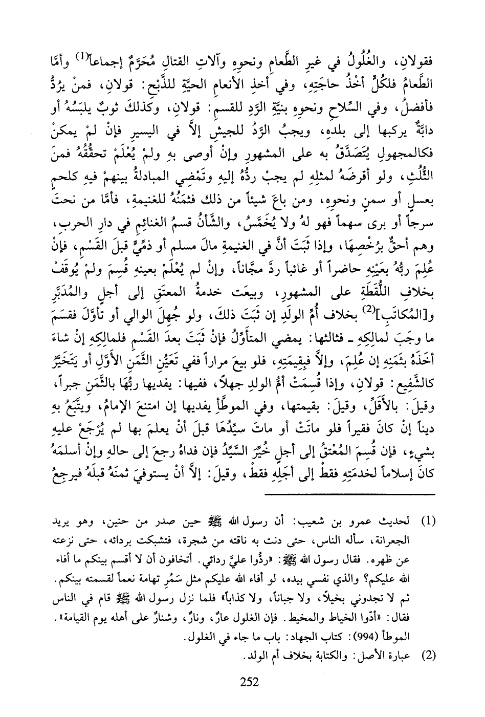 فَقَوْلانِ، وَالْغُلُولُ فِي غَيْرِ الطَّعَامِ وَنَحْوِهِ وَآلاتِ الْقِتَالِ مُحَرَّمٌ إِجْمَاعاً وَأَمَّا الطَّعَامُ فَلِكُلٍّ أَخْذُ حَاجَتِهِ، وَفِي أَخْذِ الأَنْعَامِ الْحَيَّةِ لِلذَّبْحِ: قَوْلانِ، فَمَنْ يَرُدُّ فَأَفْضَلُ، وَفِي السِّلاحِ وَنَحْوِهِ بِنِيَّةِ الرَّدِّ لِلْقَسْمِ: قَوْلانِ، وَكَذَلِكَ ثَوْبٌ يَلْبَسُهُ أَوْ دَابَّةٌ يَرْكَبُهَا إِلَى بَلَدِهِ، وَيَجِبُ الرَّدُّ لِلْجَيْشِ إِلا فِي الْيَسِيرِ فَإِنْ لَمْ يُمْكِنْ فَكَالْمَجْهُولِ يُتَصَدَّقُ بِهِ عَلَى الْمَشْهُورِ وَإِنْ أَوْصَى بِهِ وَلَمْ يُعْلَمْ تَحَقُّقُهُ فَمِنَ الثُّلُثِ، وَلَوْ أَقْرَضَهُ لِمِثْلِهِ لَمْ يَجِبْ رَدُّهُ إِلَيْهِ وَتَمْضِي الْمُبَادَلَةُ بَيْنَهُمْ فِيهِ كَلَحْمٍ بِعَسَلٍ أَوْ سَمْنٍ وَنَحْوِهِ، وَمَنْ بَاعَ شَيْئاً مِنْ ذَلِكَ فَثَمَنُهُ لِلْغَنِيمَةِ، فَأَمَّا مَنْ نَحَتَ سَرْجاً أَوْ بَرَى سَهْماً فَهُوَ لَهُ وَلا يُخَمَّسُ، وَالشَّأْنُ قَسْمُ الْغَنَائِمِ فِي دَارِ الْحَرْبِ، وَهُمْ أَحَقُّ بِرُخْصِهَا، وَإِذَا ثَبَتَ أَنَّ فِي الْغَنِيمَةِ مَالَ مُسْلِمٍ أَوْ ذِمِّيٍّ قَبْلَ