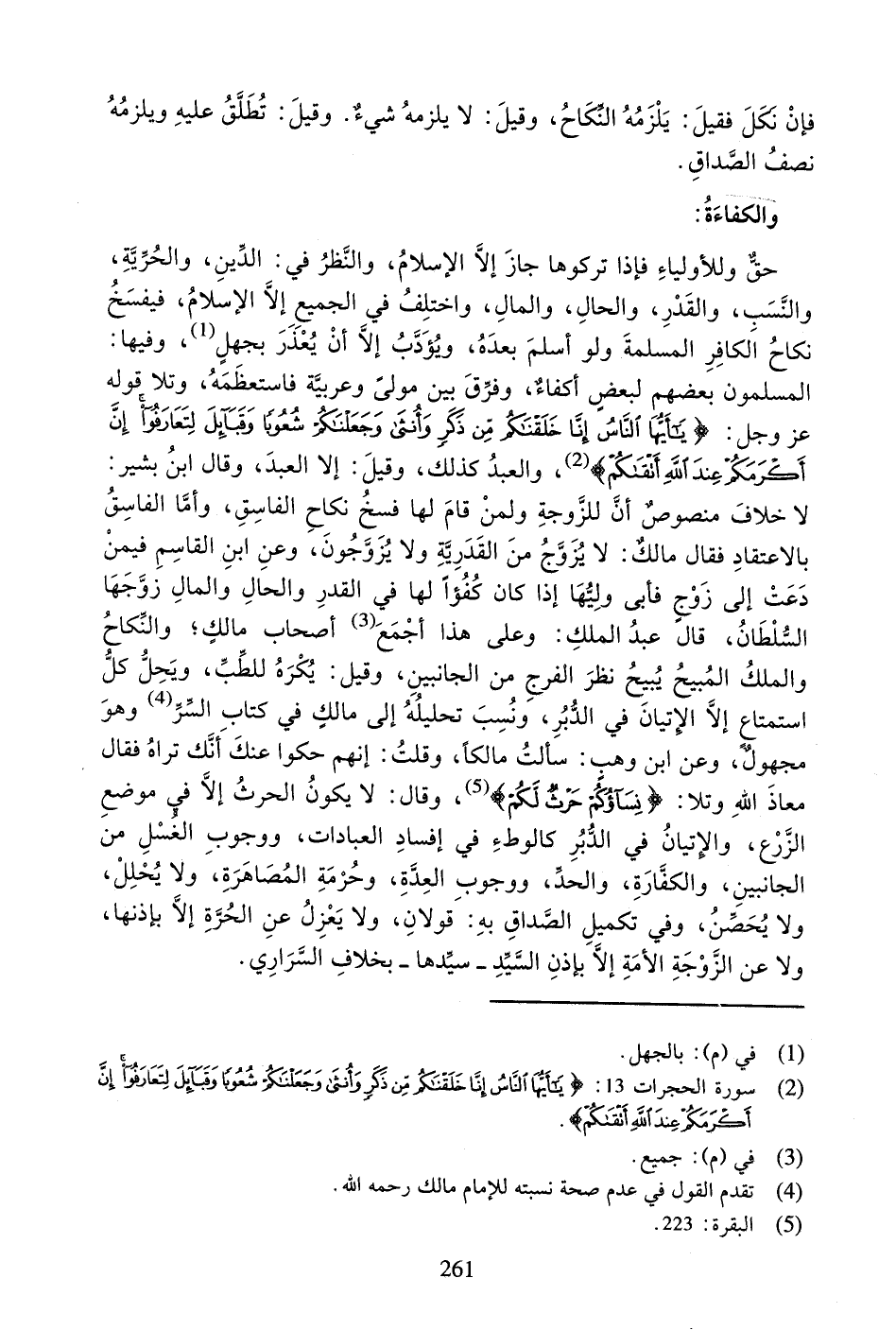حَقٌّ وَلِلأَوْلِيَاءِ فَإِذَا تَرَكُوهَا جَازَ إِلا الإِسْلامَ، وَالنَّظَرُ في: الدِّينِ، وَالْحُرِّيَّةِ، وَالنَّسَبِ، وَالْقَدْرِ، وَالْحَالِ، وَالْمَالِ، وَاخْتُلِفَ فِي الْجَمِيعِ إِلا الإِسْلامَ، فَيُفْسَخُ نِكَاحُ الْكَافِرِ الْمُسْلِمَةَ وَلَوْ أَسْلَمَ بَعْدَهُ، وَيُؤَدَّبُ إِلا أَنْ يُعْذَرَ بِجَهْلٍ (¬1)، وَفِيهَا: الْمُسْلِمُونَ بَعْضُهُمْ لِبَعْضٍ أَكْفَاءٌ، وَفُرِّقَ بَيْنَ مَوْلًى وَعَرَبِيَّةٍ فَاسْتَعْظَمَهُ، وَتَلا قَوْلَهُ عَزَّ وَجَلَّ: (يَا أَيُّهَا النَّاسُ إِنَّا خَلَقْنَاكُمْ مِنْ ذَكَرٍ وَأُنْثَى وَجَعَلْنَاكُمْ شُعُوباً وَقَبَائِلَ لِتَعَارَفُوا إِنَّ أَكْرَمَكُمْ عِنْدَ اللَّهِ أَتْقَاكُمْ)، وَالْعَبْدُ كَذَلِكَ، وَقِيلَ: إِلا الْعَبْدَ، وَقَالَ ابْنُ بَشِيرٍ: وَلا خِلافَ مَنْصُوصٌ أَنَّ لِلزَّوْجَةِ وَلِمَنْ قَامَ لَهَا فَسْخُ نِكَاحِ الْفَاسِقِ، وَأَمَّا الْفَاسِقُ بِالاعْتِقَادِ فَقَالَ مَالِكٌ: لا يُزَوَّجُ مِنَ الْقَدَرِيَّةِ وَلا يُزَوَّجُونَ، وَعَنِ ابْنِ الْقَاسِمِ فِيمَنْ دَعَتْ إِلَى زَوْجٍ فَأَبى وَلِيُّهَا إِذَا كَانَ كُفْؤاً لَهَا فِي الْقَدْرِ وَالْحَالِ وَالْمَالِ زَوَّجَهَا السُّلْطَانُ، قَالَ عَبْدُ الْمَلِكِ: وَعَلَى هَذَا أَجْمَعَ (¬2)
