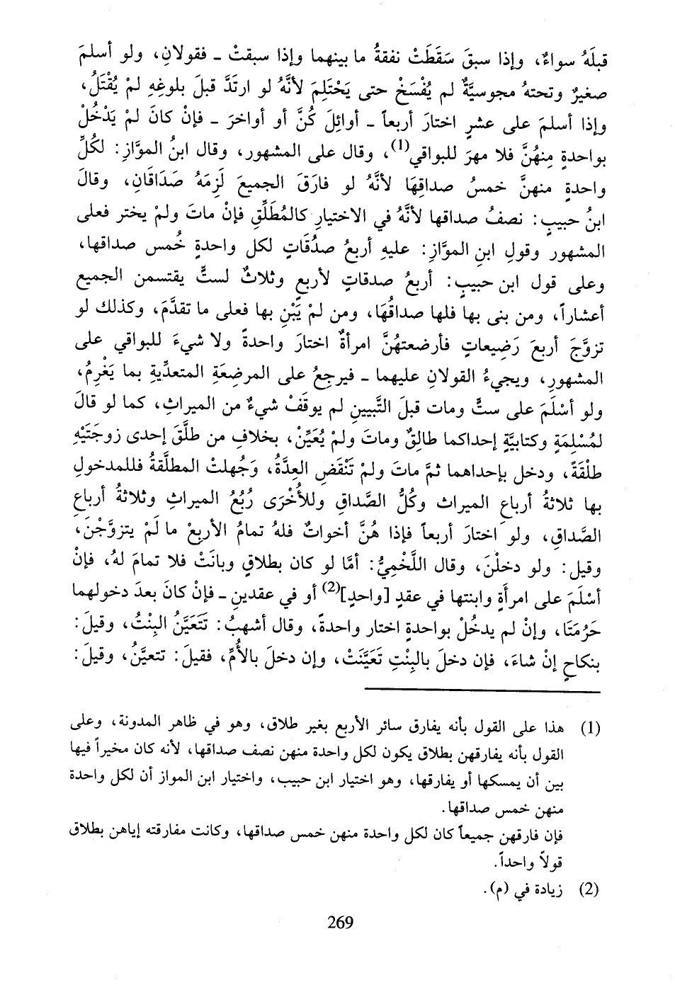 الْمَشْهُورِ، وَقَالَ ابْنُ الْمَوَّازِ: لِكُلِّ وَاحِدَةٍ مِنْهُنَّ خُمُسُ صَدَاقِهَا لأَنَّهُ لَوْ فَارَقَ الْجَمِيعَ لَزِمَهُ صَدَاقَانِ، وَقَالَ ابْنُ حَبِيبٍ: نِصْفُ صَدَاقِهَا لأَنَّهُ فِي الاخْتِيَارِ كَالْمُطَلِّقِ فَإِنْ مَاتَ وَلَمْ يَخْتَرْ فَعَلَى الْمَشْهُورِ وَقَوْلُ ابْنِ الْمَوَّازِ: عَلَيْهِ أَرْبَعُ صَدَقَاتٍ لِكُلِّ وَاحِدَةٍ خُمُسُ صَدَاقِهَا، وَعَلَى قَوْلِ ابْنِ حَبِيبٍ: أَرْبَعُ صَدَقَاتٍ لأَرْبَعٍ وَثَلاثٍ لِسِتٍّ يَقْتَسِمْنَ الْجَمِيعَ أَعْشَاراً، وَمَنْ بَنَى بِهَا فَلَهَا صَدَاقُهَا، وَمَنْ لَمْ يَبْنِ بِهَا فَعَلَى مَا تَقَدَّمَ، وَكَذَلِكَ لَوْ تَزَوَّجَ أَرْبَعَ رَضِيعَاتٍ فَأَرْضَعَتْهُنَّ امْرَأَةٌ اخْتَارَ وَاحِدَةً وَلا شَيْءَ لِلْبَوَاقِي عَلَى الْمَشْهُورِ، وَيَجِيءُ الْقَوْلانِ عَلَيْهِمَا - فَيَرْجِعُ عَلَى الْمُرْضِعَةِ الْمُتَعَدِّيَةِ بِمَا يَغْرَمُ، وَلَوْ أَسْلَمَ عَلَى سِتٍّ وَمَاتَ قَبْلَ التَّبْيِينِ لَمْ يُوقَفْ شَيْءٌ مِنَ الْمِيرَاثِ، كَمَا لَوْ قَالَ لِمُسْلِمَةٍ وَكِتَابِيَّةٍ: إِحْدَاكُمَا طَالِقٌ وَمَاتَ وَلَمْ يُعَيِّنْ، بِخِلافِ مَنْ طَلَّقَ إِحْدَى زَوْجَتَيْهِ طَلْقَةً، وَدَخَلَ بِإِحْدَاهُمَا ثُمَّ مَاتَ وَلَمْ تَنْقَضِ الْعِدَّةُ، وَجَهِلَتِ الْمُطَلَّقَةُ فَلِلْمَدْخُولِ بِهَا ثَلاثَةُ أَرْبَاعِ الْمِيرَاثً وَكُلُّ الصَّدَاقِ وَلِلأُخْرَى رُبُعُ الْمِيرَاثِ وَثَلاثَةُ أَرْبَاعِ الصَّدَاقِ، وَلَوِ اخْتَارَ أَرْبَعاً فَإِذَا هُنَّ أَخَوَاتٌ فَلَهُ تَمَامُ الأَرْبَعِ مَا لَمْ يَتَزَوَّجْنَ، وَقِيلَ: وَلَوْ دَخَلْنَ، وَقَالَ اللَّخْمِيُّ: أَمَّا لَوْ كَانَ بِطَلاقٍ وَبَانَتْ فَلا تَمَامَ لَهُ، فَإِنْ أَسْلَمَ عَلَى امْرَأَةٍ وَابْنَتِهَا فِي عَقْدٍ [وَاحِدٍ] أَوْ