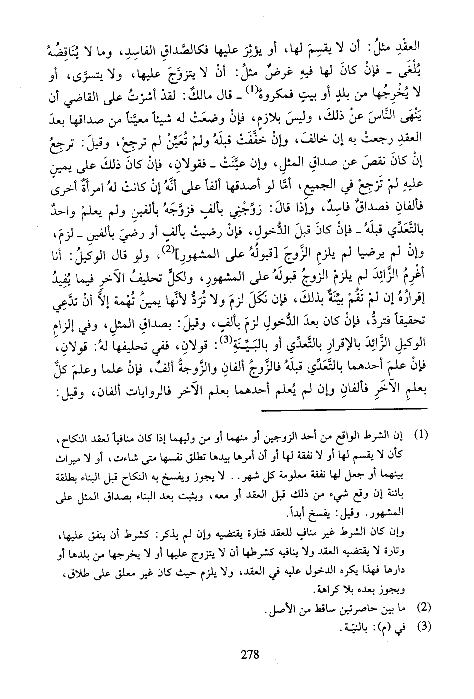 الْعَقْدِ مِثْلَ: أَنْ لا يَقْسِمَ لَهَا، أَوْ يُؤْثِرَ عَلَيْهَا فَكَالصَّدَاقِ الْفَاسِدِ، وَما لا يُنَاقِضُهُ يُلْغَى - فَإِنْ كَانَ لَهَا فِيهِ غَرَضٌ مِثْلَ: أَنْ لا يَتَزَوَّجَ عَلَيْهَا، وَلا يَتَسَرَّى، أَوْ لا يُخْرِجُهَا مِنْ بَلَدٍ أَوْ بَيْتٍ فَمَكْرُوهٌ - قَالَ مَالِكٌ: لَقَدْ أَشَرْتُ عَلَى الْقَاضِي أَنْ يَنْهَى النَّاسَ عَنْ ذَلِكَ، وَلَيْسَ بِلازَمٍ، فَإِنْ وَضَعَتْ لَهُ شَيْئاً مُعَيَّناً مِنْ صَدَاقِهَا بَعْدَ الْعَقْدِ رَجَعَتْ بِهِ إِنْ خَالَفَ، وَإِنْ خَفَّفَتْ قَبْلَهُ وَلَمْ تُعَيِّنْ لَمْ تَرْجِعْ، وَقِيلَ: تَرْجِعُ إِنْ كَانَ نَقَصَ مِنْ صَدَاقِ الْمِثْلِ، وَإِنْ عَيَّنَتْ - فَقَوْلانِ، فَإِنْ كَانَ ذَلِكَ عَلَى يَمِينٍ عَلَيْهِ لَمْ تَرْجِعْ فِي الْجَمِيعِ، أَمَّا لَوْ أَصْدَقَهَا أَلْفاً عَلَى أَنَّهُ إِنْ كَانَتْ لَهُ امْرَأَةٌ أُخْرَى فَأَلْفَانِ فَصَدَاقٌ فَاسِدٌ، وَإِذَا قَالَ: زَوِّجْنِي بِأَلْفٍ فَزَوَّجَهُ بِأَلْفَيْنِ وَلَمْ يَعْلَمْ وَاحِدٌ بِالتَّعَدِّي قَبْلَهُ - فَإِنْ كَانَ قَبْلَ