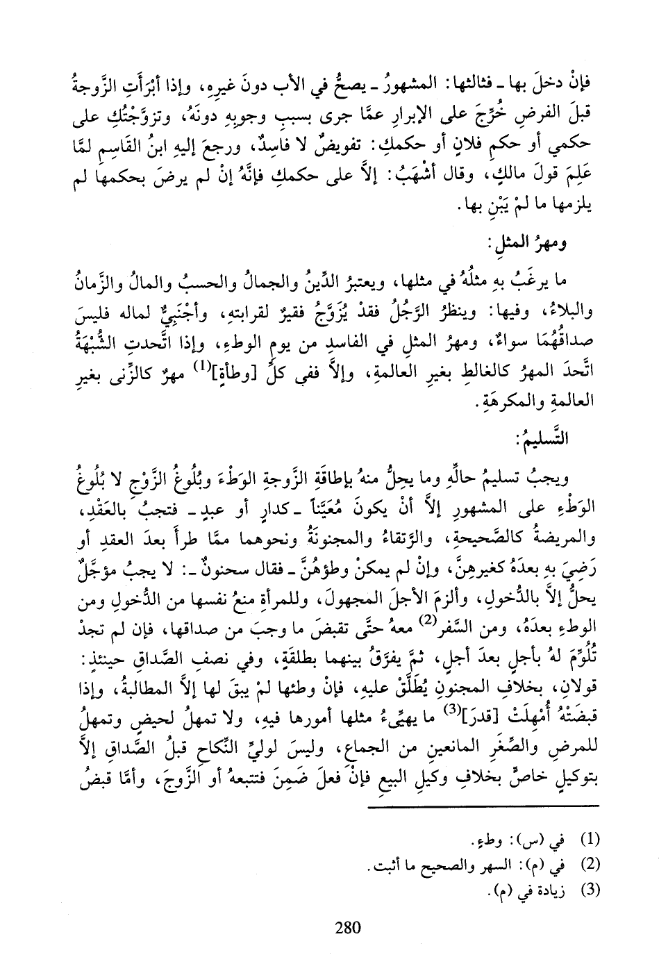 وَيَجِبُ تَسْلِيمُ حَالِهِ وَمَا يَحِلُّ مِنْهُ بِإِطَاقَةِ الزَّوْجَةِ الْوَطْءَ وَبُلُوغِ الزَّوْجِ لا بُلُوغِ الْوَطْءِ عَلَى الْمَشْهُورِ إِلا أَنْ يَكُونَ مُعَيَّناً - كَدَارٍ أَوْ عَبْدٍ - فَتَجِبُ بِالْعَقْدِ، وَالْمَرِيضَةُ كَالصَّحِيحَةِ، وَالرَّتْقَاءُ وَالْمَجْنُونَةُ وَنَحْوُهُمَا مِمَّا طَرَأَ بَعْدَ الْعَقْدِ أَوْ رَضِيَ بِهِ بَعْدَهُ كَغَيْرِهِنَّ، وَإِنْ لَمْ يُمْكِنْ وَطْؤُهُنَّ - فَقَالَ سَحْنُونٌ -: لا يَجِبُ مُؤَجَّلٌ يَحِلُّ إِلا بِالدُّخُولِ، وَأَلْزَمَ الأَجَلَ الْمَجْهُولَ، وَلِلْمَرْأَةِ مَنْعُ نَفْسِهَا مِنَ الدُّخُولِ وَمِنَ الْوَطْءِ بَعْدَهُ، وَمِنَ السَّفَرِ (¬1)