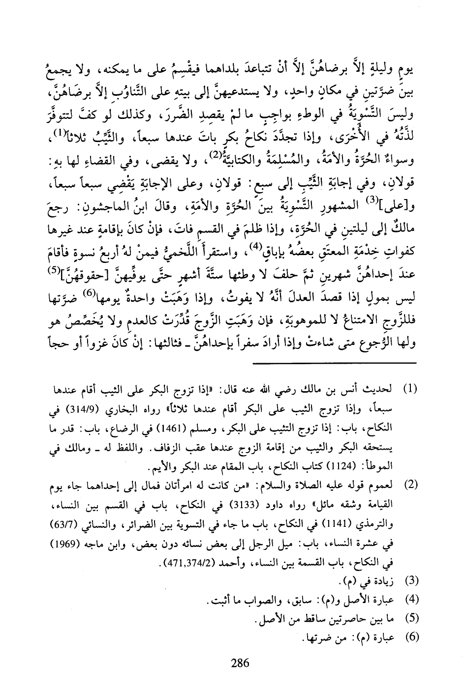 يَوْمٍ وَلَيْلَةٍ إِلا بِرِضَاهُنَّ إِلا أَنْ تَتَبَاعَدَ بَلَدَاهُمَا فَيَقْسِمُ عَلَى مَا يُمْكِنُهُ، وَلا يَجْمَعُ بَيْنَ ضَرَّتَيْنِ فِي مَكَانٍ وَاحِدٍ، وَلا يَسْتَدْعِيهُنَّ إِلَى بَيْتِهِ عَلَى التَّنَاوُبِ إِلا بِرِضَاهُنَّ، وَلَيْسَ التَّسْوِيَةُ فِي الْوَطْءِ بِوَاجِبٍ مَا لَمْ يُقْصَدِ الضَّرَرُ، وَكَذَلِكَ لَوْ كَفَّ لِتَتَوَقَّرَ لَذَّتُهُ فِي الأُخْرَى، وَإِذَا تَجَدَّدَ نِكَاحُ بِكْرٍ بَاتَ عِنْدَهَا سَبْعاً، وَالثَّيِّبُ ثَلاثاً، وَسَوَاءٌ الْحُرَّةُ وَالأَمَةُ، وَالْمُسْلِمَةُ وَالْكِتَابِيَّةُ، وَلا يُقْضَى، وَفِي الْقَضَاءِ لَهَا بِهِ: قَوْلانِ، وَفِي إِجَابَةِ الثَّيِّبِ إِلَى سَبْعٍ: قَوْلانِ، وَعَلَى الإِجَابَةِ يَقْضِي سَبْعاً سَبْعاً، وَ [عَلَى] الْمَشْهُورِ التَّسْوِيَةُ بَيْنَ الْحُرَّةِ وَالأَمَةِ، وَقَالَ ابْنُ الْمَاجِشُونِ: رَجَعَ مَالِكٌ إِلَى لَيْلَتَيْنِ فِي الْحُرَّةِ، وَإِذَا ظَلَمَ فِي الْقَسْمِ فَاتَ، فَإِنْ كَانَ