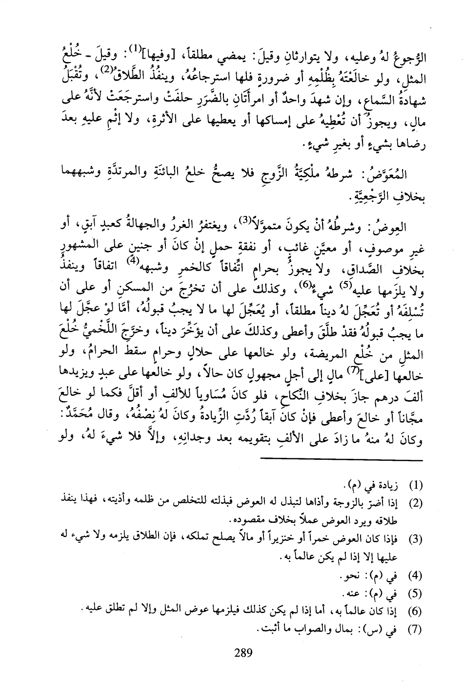 الْعِوَضُ: وَشَرْطُهُ أَنْ يَكُونَ مُتَمَوِّلاً، وَيُغْتَفَرُ الْغَرَرُ وَالْجَهَالَةُ كَعَبْدٍ آبِقٍ، أَوْ غَيْرِ مَوْصُوفٍ، أَوْ مُعَيَّنٍ غَائِبٍ، أَوْ نَفَقَةِ حَمْلٍ إِنْ كَانَ أَوْ جَنِينٍ عَلَى الْمَشْهُورِ بِخِلافِ الصَّدَاقِ، وَلا يَجُوزُ بِحَرَامٍ اتِّفَاقاً كَالْخَمْرِ وَشِبْهِهِ (¬1) اتِّفَاقاً وَيَنْفُذُ وَلا يَلْزَمُهَا عَلَيْهِ (¬2)