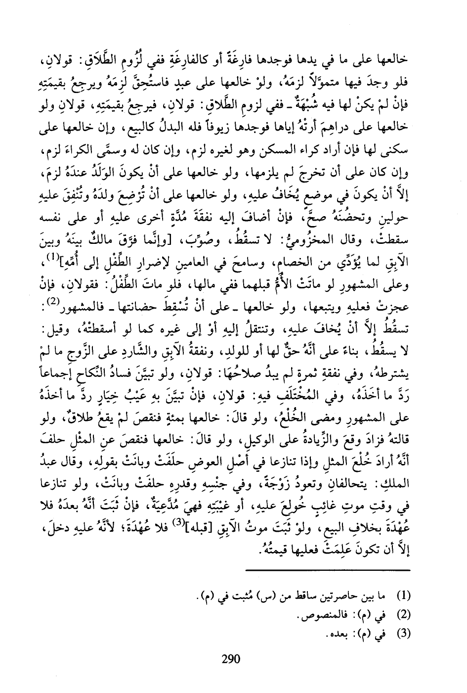تَسْقُطُ إِلا أَنْ يُخَافَ عَلَيْهِ، وَتَنْتَقِلُ إِلَيْهِ أَوْ إِلَى غَيْرِهِ كَمَا لَوْ أَسْقَطَتْهُ، وَقِيلَ: لا يَسْقُطُ، بِنَاءً عَلَى أَنَّهُ حَقٌّ لَهَا أَوْ لِلْوَلَدِ، وَنَفَقَةُ الآبِقِ وَالشَّارِدِ عَلَى الزَّوْجِ مَا لَمْ يَشْتَرِطْهُ، وَفِي نَفَقَةِ ثَمَرَةٍ لَمْ يَبْدُ صَلاحُهَا: قَوْلانِ، وَلَوْ تَبَيَّنَ فَسَادُ النِّكَاحِ إِجْمَاعاً رَدَّ مَا أَخَذَهُ، وَفِي الْمُخْتَلَفِ فِيهِ: قَوْلانِ، فَإِنْ تَبَيَّنَ بِهِ عَيْبُ خِيَارٍ رَدَّ مَا أَخَذَهُ عَلَى الْمَشْهُورِ وَمَضَى الْخُلْعُ، وَلَوْ قَالَ: خَالَعَهَا بِمِئَةٍ فَنَقَصَ لَمْ يَقَعْ طَلاقٌ، وَلَوْ قَالَتْهُ فَزَادَ وَقَعَ وَالزِّيَادَةُ عَلَى الْوَكِيلِ، وَلَوْ قَالَ: خَالَعَهَا فَنَقَصَ عَنِ الْمِثْلِ حَلَفَ أَنَّهُ أَرَادَ خُلْعَ الْمِثْلِ وَإِذَا تَنَازَعَا فِي أَصْلِ الْعِوَضِ حَلَفَتْ وَبَانَتْ بِقَوْلِهِ، وَقَالَ عَبْدُ الْمَلِكِ: يَتَحَالَفَانِ وَتَعُودُ زَوْجَةً، وَفِي جِنْسِهِ وَقَدْرِهِ حَلَفَتْ وَبَانَتْ، وَلَوْ تَنَازَعَا فِي وَقْتِ مَوْتِ غَائِبٍ خُولِعَ عَلَيْهِ، أَوْ غَيْبَتِهِ فَهِيَ مُدَّعِيَةٌ، فَإِنْ ثَبَتَ أَنَّهُ بَعْدَهُ فَلا عُهْدَةَ بِخِلافِ الْبَيْعِ، وَلَوْ ثَبَتَ مَوْتُ الآبِقِ [قَبْلَهُ] (¬2) فَلا عُهْدَةَ؛ لأَنَّهُ عَلَيْهِ دَخَلَ، إِلا أَنْ تَكُونَ عَلِمَتْ فَعَلَيْهَا قِيمَتُهُ.