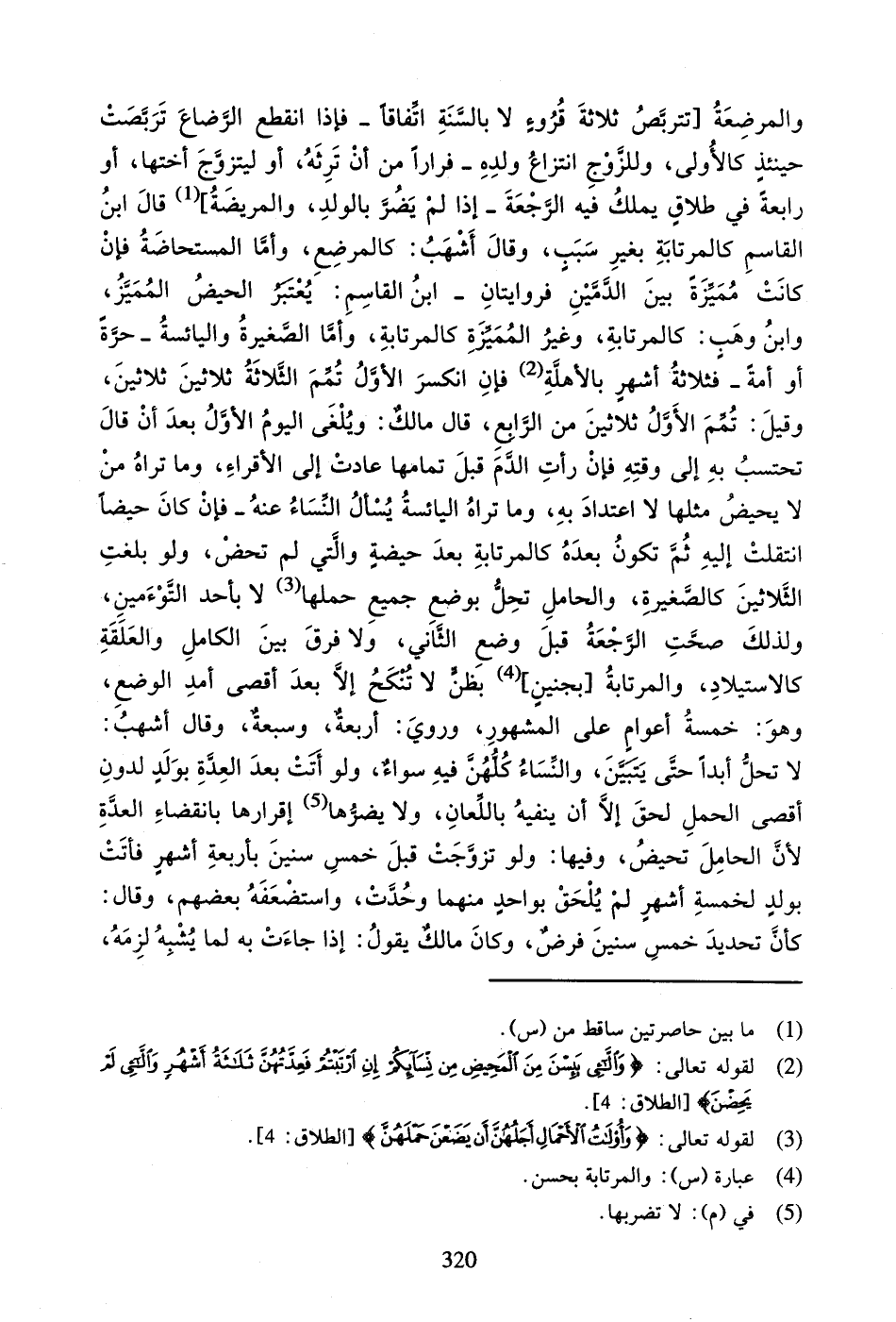وَالْمُرْضِعَةُ [تَتَرَبَّصُ ثَلاثَةَ قُرُوءٍ لا بِالسَّنَةِ اتِّفَاقاً - فَإِذَا انْقَطَعَ الرَّضَاعُ تَرَبَّصَتْ حِينَئِذٍ كالأُولَى، وَلِلزَّوْجِ انْتِزَاعُ وَلَدِهِ - فِرَاراً مِنْ أَنْ تَرِثَهُ، أَوْ لِيَتَزَوَّجَ أُخْتَهَا، أَوْ رَابِعَةً فِي طَلاقٍ يَمْلِكُ فِيهِ الرَّاجِعَةَ - إِذَا لَمْ يَضُرَّ بِالْوَلَدِ، وَالْمَرِيضَةُ] قَالَ ابْنُ الْقَاسِمِ كَالْمُرْتَابَةِ بِغَيْرِ سَبَبٍ، وَقَالَ أَشْهَبُ: كَالْمُرْضِعِ، وَأَمَّا الْمُسْتَحَاضَةُ فَإِنْ كَانَتْ مُمَيِّزَةً بَيْنَ الدَّمَيْنِ فَرِوَايَتَانِ - ابْنُ الْقَاسِمِ: يُعْتَبَرُ الْحَيْضُ الْمُمَيَّزُ، وَابْنُ وَهْبٍ: كَالْمُرْتَابَةِ، وَغَيْرُ الْمُمَيِّزَة كَالْمُرْتَابَةِ، وَأَمَّا الصَّغِيرَةُ وَالْيَائِسَةُ - حُرَّةً أَوْ أَمَةً - فَثَلاثَةُ أَشْهُرٍ بِالأَهِلَّةِ فَإِنِ انْكَسَرَ الأَوَّلُ تُمِّمَ الثَّلاثَةُ ثَلاثِينَ ثَلاثِينَ، وَقِيلَ: تُمِّمَ الأَوَّلُ ثَلاثِينَ مِنَ الرَّابِعِ، قَالَ مَالِكٌ: وَيُلْغَى الْيَوْمُ الأَوَّلُ بَعْدَ أَنْ قَالَ تَحْتَسِبُ بِهِ إِلَى وَقْتِهِ فَإِنْ رَأَتِ الدَّمَ قَبْلَ تَمَامِهَا عَادَتْ إِلَى الأَقْرَاءِ، وَما تَرَاهُ مَنْ لا يَحِيضُ مِثْلُهَا لا اعْتِدَادَ بِهِ، وَما تَرَاهُ الْيَائِسَةُ يُسْأَلُ النِّسَاءُ عَنْهُ - فَإِنْ كَانَ حَيْضاً انْتَقَلَتْ إِلَيْهِ ثُمَّ تَكُونُ بَعْدَهُ كَالْمُرْتَابَةِ بَعْدَ حَيْضَةٍ وَالَّتِي لَمْ تَحِضْ، وَلَوْ بَلَغَتِ الثَّلاثِينَ كَالصَّغِيرَةِ، وَالْحَامِلُ تَحِلُّ بِوَضْعِ جَمِيعِ حَمْلِهَا لا بِأَحَدِ
