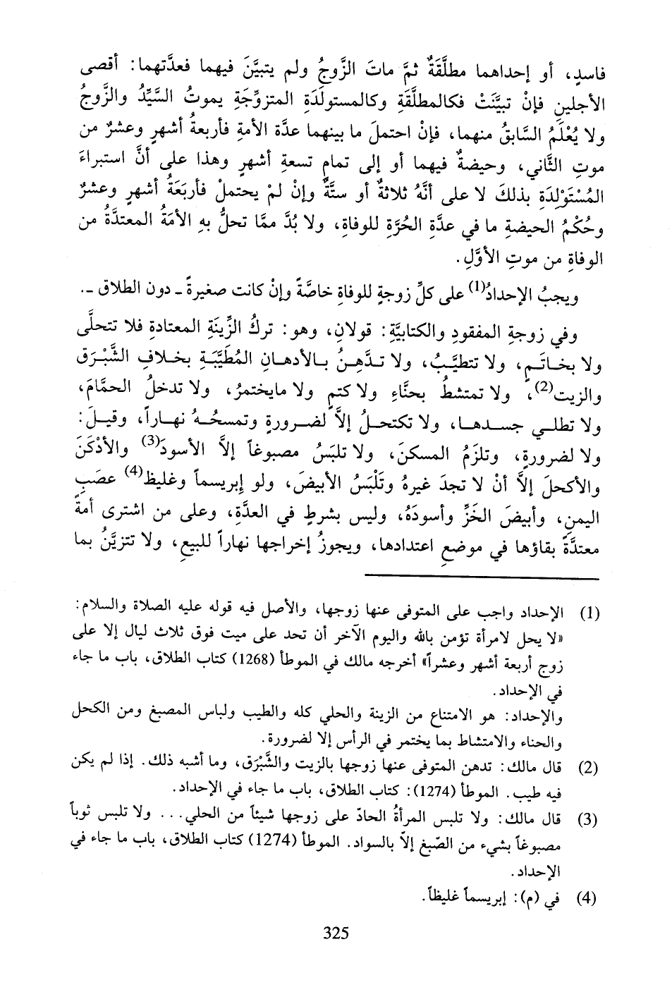 وَفِي زَوْجَةِ الْمَفْقُودِ وَالْكِتَابِيَّةِ: قَوْلانِ، وَهو: تَرْكُ الزِّينَةِ الْمُعْتَادَةِ فَلا تَتَحَلَّى وَلا بِخَاتَمٍ، وَلا تَتَطَيَّبُ، وَلا تَدَّهِنُ بِالأَدْهَانِ الْمُطَيِّبَةِ بِخِلافِ الشَّبْرَقِ وَالزَّيْتِ، وَلا تَمْتَشِطُ بِحِنَّاءٍ وَلا كَتَمٍ وَلا مَا يُخْتَمَرُ، وَلا تَدْخُلُ الْحَمَّامَ، وَلا تُطْلِي جَسَدَهَا، وَلا تَكْتَحِلُ إِلا لِضَرُورَةٍ وَتَمْسَحُهُ نَهَاراً، وَقِيلَ: وَلا لِضَرُورَةٍ، وَتَلْزَمُ الْمَسْكَنَ، وَلا تَلْبَسُ الأَبْيَضَ، وَلَوْ إِبْرِيسَماً وَغَلِيظَ (¬1) عُصُبِ الْيَمَنِ، وَأَبْيَضَ الْخَزِّ وَأَسْوَدَهُ، وَلَيْسَ بِشَرْطٍ فِي الْعِدَّةِ، وَعَلَى مَنِ اشْتَرَى أَمَةً مُعْتَدَّةً بَقَاؤُهَا فِي مَوْضِعِ اعْتِدَادِهَا، وَيَجُوزُ إِخْرَاجُهَا نَهَاراً لِلْبَيْعِ، وَلا تَتَزَيَّنُ بِمَا