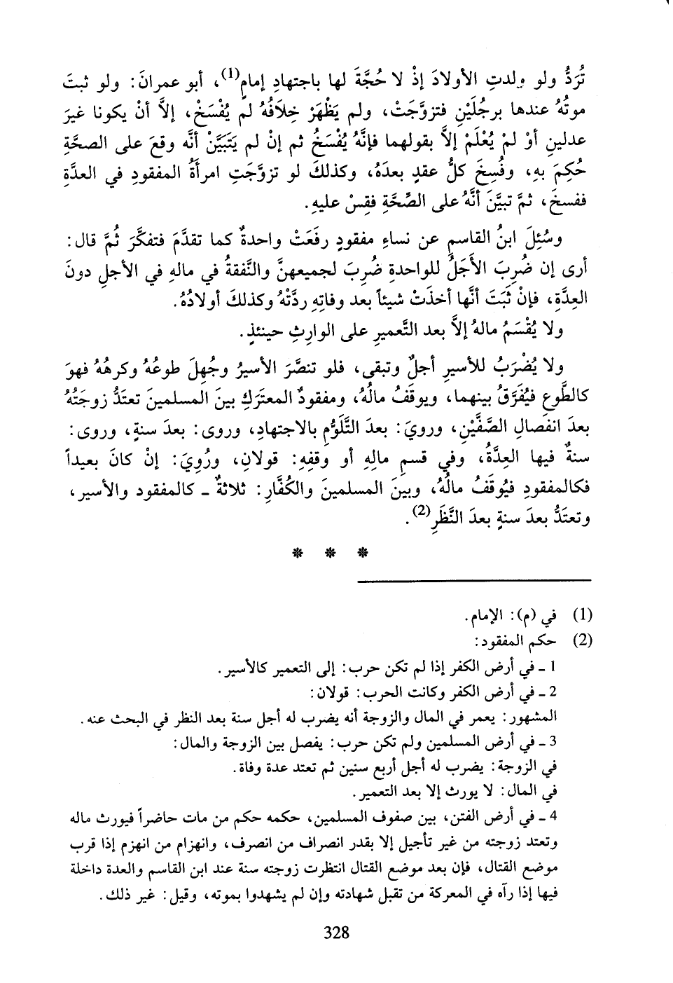 وَلا يُضْرَبُ لِلأَسِيرِ أَجَلٌ وَتَبْقَى، فَلَوْ تَنَصَّرَ الأَسِيرُ وَجُهِلَ طَوْعُهُ وَكُرْهُهُ فَهُوَ كَالطَّوْعِ فَيُفَرَّقُ بَيْنَهُمَا، وَيُوقَفُ مَالُهُ، وَمَفْقُودُ الْمُعْتَرَكِ بَيْنَ الْمُسْلِمِينَ تَعْتَدُّ زَوْجَتُهُ بَعْدَ انْفِصَالِ الصَّفَّيْنِ، وَرُوِيَ: بَعْدَ التَّلَوُّمِ بِالاجْتِهَادِ، وَرُوِيَ: بَعْدَ سَنَةٍ، وَرُوِيَ: سَنَةٌ فِيهَا الْعِدَّةُ، وَفِي قَسْمِ مَالِهِ أَوْ وَقْفِهِ: قَوْلانِ، وَرُوِيَ: إِنْ كَانَ بَعِيداً فَكَالْمَفْقُودِ فَيُوقَفُ مَالُهُ، وَبَيْنَ الْمُسْلِمِينَ وَالْكُفَّارِ: ثَلاثَةٌ - كَالْمَفْقُودِ وَالأَسِيرِ، وَتَعْتَدُّ بَعْدَ سَنَةٍ بَعْدَ النَّظَرِ.