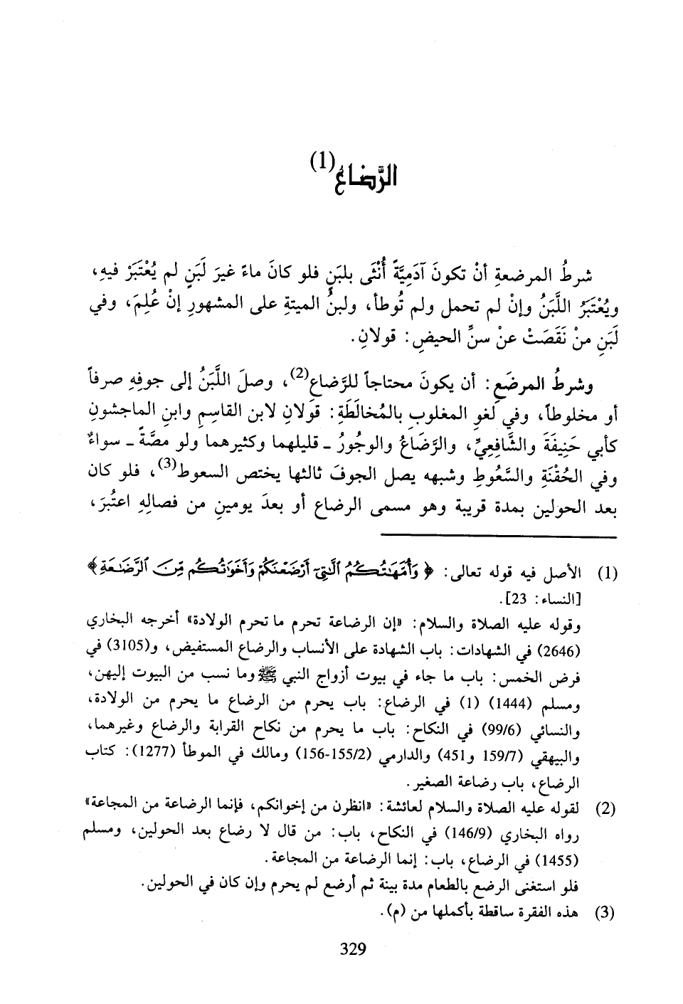وَشَرْطُ الْمُرْضِعِ: أَنْ يَكُونَ مُحْتَاجَا لِلرَّضَاعِ، وَصَلَ اللَّبَنُ إِلَى جَوْفِهِ صِرْفاً أَوْ مَخْلُوطاً، وَفِي لَغْوِ الْمَغْلُوبِ بِالْمُخَالَطَةِ: قَوْلانِ لابْنِ الْقَاسِمِ وَابْنِ الْمَاجِشُونِ كَأَبِي حَنِيفَةَ وَالشَّافِعِيِّ، وَالرَّضَاعُ وَالْوَجُورُ - قَلِيلُهُمَا وَكَثِيرُهُمَا وَلَوْ مَصَّةً - سَوَاءٌ وَفِي الْحُقْنَةِ وَالسَّعُوطِ وَشِبْهِهِ يَصِلُ الْجَوْفَ ثَالِثُهَا يَخْتَصُّ السَّعُوطُ، فَلَوْ كَانَ بَعْدَ الْحَوْلَيْنِ بِمُدَّةٍ قَرِيبَةٍ وَهُوَ مُسَمَّى الرَّضَاعِ أَوْ بَعْدَ يَوْمَيْنِ مِنْ فِصَالِهِ اعْتُبِرَ،
