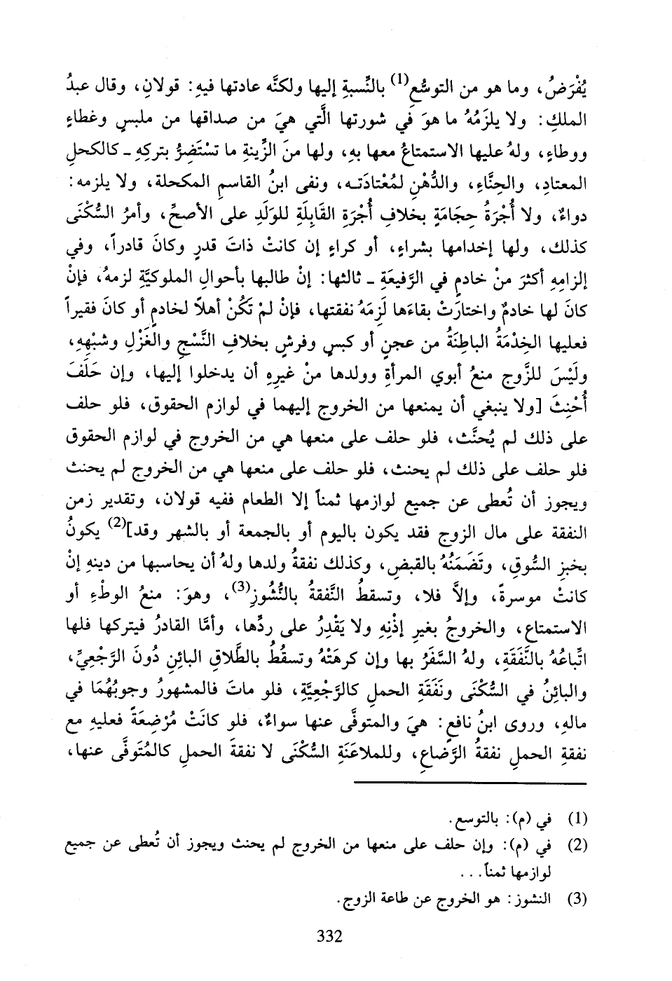 يَكُونُ بِخُبْزِ السُّوقِ، وَتَضْمَنُهُ بِالْقَبْضِ، وَكَذَلِكَ نَفَقَةُ وَلَدِهَا وَلَهُ أَنْ يُحَاسِبَهَا مِنْ دَيْنِهِ إِنْ كَانَتْ مُوسِرَةً، وَإِلا فَلا، وَتَسْقُطُ النَّفَقَةُ بِالنُّشُوزِ، وَهُوَ: مَنْعُ الوَطْءِ أَوِ الاسْتِمْتَاعِ، وَالْخُرُوجِ بِغَيْرِ إِذْنِهِ وَلا يَقْدِرُ عَلَى رَدِّهَا، وَأَمَّا الْقَادِرُ فَيَتْرُكُهَا فَلَهَا اتِّبَاعُهُ بِالنَّفَقَةِ، وَلَهُ السَّفَرُ بِهَا وَإِنْ كَرِهَتْهُ وَتَسْقُطُ بِالطَّلاقِ الْبَائِنِ دُونَ الرَّجْعِيِّ، وَالْبَائِنُ فِي السُّكْنَى وَنَفَقَةِ الْحَمْلِ كَالرَّجْعِيَّةِ، فَلَوْ مَاتَ فَالْمَشْهُورُ وُجُوبُهُمَا فِي مَالِهِ، وَرَوَى ابْنُ نَافِعٍ: هِيَ وَالْمُتَوَفَّى عَنْهَا سَوَاءٌ، فَلَوْ كَانَتْ مُرْضِعَةً فَعَلَيْهِ مَعَ نَفَقَةِ الْحَمْلِ نَفَقَةُ الرَّضَاعِ، وَلِلْمُلاعِنَةِ السُّكْنَى لا نَفَقَةُ الْحَمْلِ كَالْمُتَوَفَّى عَنْهَا،