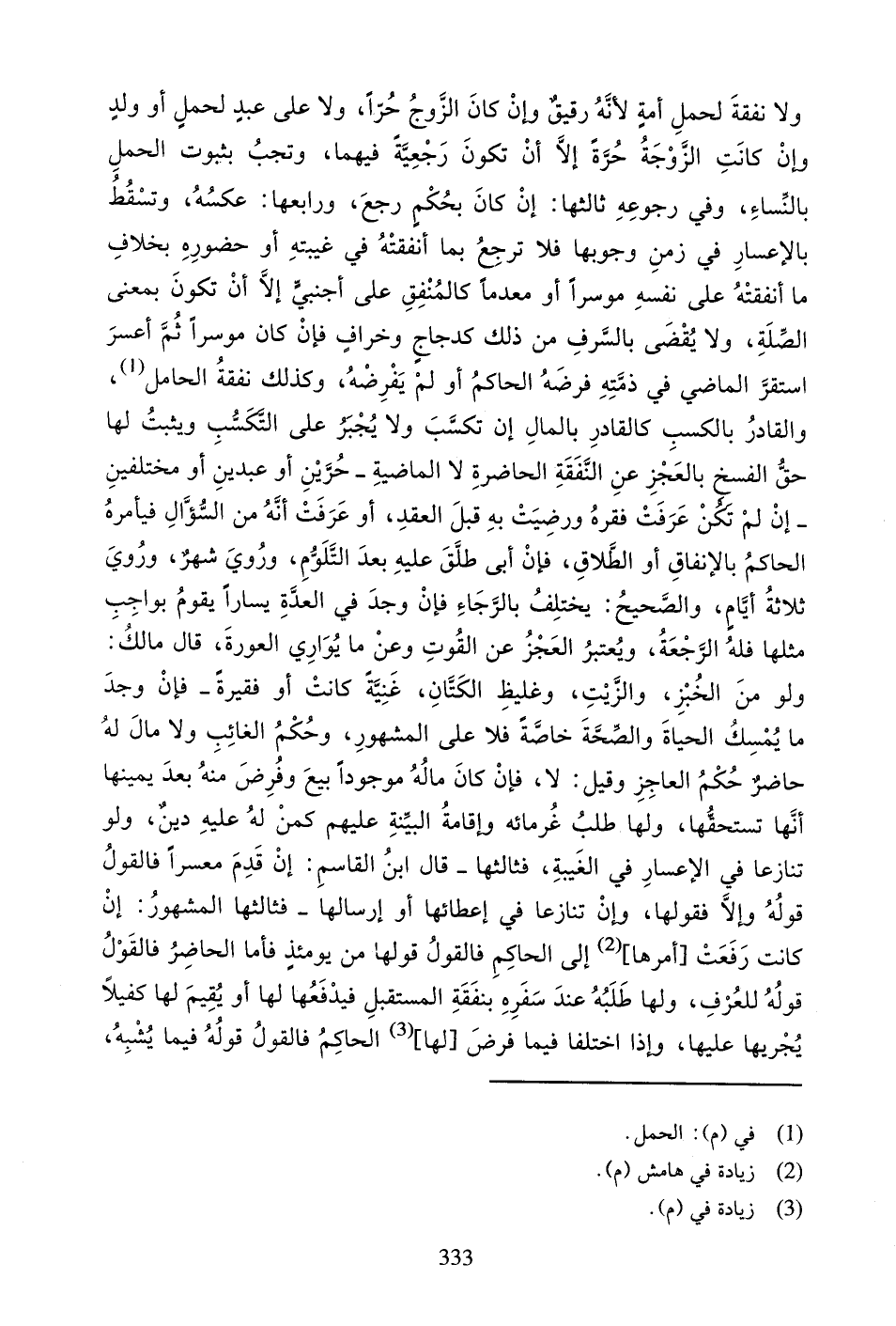 وَلا نَفَقَةَ لِحَمْلِ أَمَةٍ لأَنَّهُ رَقِيقٌ وَإِنْ كَانَ الزَّوْجُ حُرّاً، وَلا عَلَى عَبْدٍ لِحَمْلٍ أَوْ وَلَدٍ وَإِنْ كَانَتِ الزَّوْجَةُ حُرَّةً إِلا أَنْ تَكُونَ رَجْعِيَّةً فِيهِمَا، وَتَجِبُ بِثُبُوتِ الْحَمْلِ بِالنِّسَاءِ، وَفِي رُجُوعِهِ ثَالِثُهَا: إِنْ كَانَ بِحُكْمٍ رَجَعَ، وَرَابِعُهَا: عَكْسُهُ، وَتَسْقُطُ بِالإِعْسَارِ فِي زَمَنِ وُجُوبِهَا فَلا تَرْجِعُ بِمَا أَنْفَقَتْهُ فِي غِيبَتِهِ أَوْ حُضُورِهِ بِخِلافِ مَا أَنْفَقَتْهُ عَلَى نَفْسِهِ مُوسِراً أَوْ مُعْدَماً كَالْمُنْفِقِ عَلَى أَجْنَبِيٍّ إِلا أَنْ تَكُونَ بِمَعْنَى الصِّلَةِ، وَلا يُقْضَى بِالسَّرَفِ مِنْ ذَلِكَ كَدَجَاجٍ وَخِرَافٍ فَإِنْ كَانَ مُوسِراً ثُمَّ أَعْسَرَ اسْتَقَرَّ الْمَاضِي فِي ذِمَّتِهِ فَرَضَهُ الْحَاكِمُ أَوْ لَمْ يَفْرِضْهُ،
