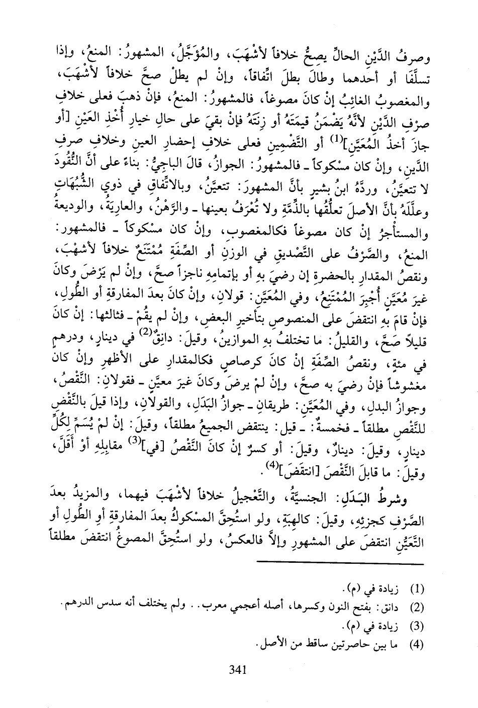 وَصَرْفُ الدَّيْنِ الْحَالِّ يَصِحُّ خِلافاً لأَشْهَبَ، وَالْمُؤَجَّلُ، الْمَشْهُورُ: الْمَنْعُ، وَإِذَا تَسَلَّفَا أَوْ أَحَدُهُمَا وَطَالَ بَطَلَ اتِّفَاقاً، وَإِنْ لَمْ يَطُلْ صَحَّ خِلافاً لأَشْهَبَ، وَالْمَغْصُوبُ الْغَائِبُ إِنْ كَانَ مَصُوغاً، فَالْمَشْهُورُ: الْمَنْعُ، فَإِنْ ذَهَبَ فَعَلَى خِلافِ صَرْفِ الدَّيْنِ لأَنَّهُ يَضْمَنُ قِيمَتَهُ أَوْ زِنَتَهُ فَإِنْ بَقِيَ عَلَى حَالِ خِيَارِ أَخْذِ الْعَيْنِ [أَوْ جَازَ أَخْذُ الْمُعَيَّنِ] أَوِ التَّضْمِينِ فَعَلَى خِلافِ إِحْضَارِ الْعَيْنِ وَخِلافِ صَرْفِ الدَّيْنِ، وَإِنْ كَانَ مَسْكُوكاً - فَالْمَشْهُورُ: الْجَوَازُ، قَالَ الْبَاجِيُّ: بِنَاءً عَلَى أَنَّ النُّقُودَ لا تَتَعَيَّنُ، وَرَدَّهُ ابْنُ بَشِيرٍ بِأَنَّ الْمَشْهُورَ: تَتَعَيَّنُ، وَبِالاتِّفَاقِ فِي ذَوِي الشُّبُهَاتِ وَعَلَّلَهُ بِأَنَّ الأَصْلَ تَعَلُّقَهَا بِالذِّمَّةِ وَلا تُعْرَفُ بِعَيْنِهَا - وَالرَّهْنِ، وَالْعَارِيَةِ، وَالْوَدِيعَةِ وَالْمُسْتَأْجَرُ إِنْ كَانَ مَصُوغاً فَكَالْمَغْصُوبِ، وَإِنْ كَانَ مَسْكُوكاً -