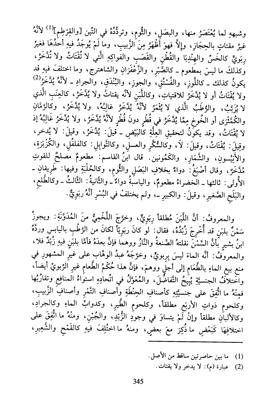 وَلا يُقْتَاتُ أَوْ لا يُدَّخَرُ لِلاقْتِيَاتِ، وَكَاللَّبَنِ لأَنَّهُ يُقْتَاتُ وَلا يُدَّخَرُ، كَالْعِنَبِ الَّذِي لا يُزَبَّبُ، وَالرُّطَبِ الَّذِي لا يُثْمَرُ لأَنَّهُ يَدْخُلُ غَالِبُهُ، وَلا يُدَّخَرُ، وَكَالرُّمَّانِ وَالْكُمَّثْرَى أَوِ الْخُوخِ مِمَّا يُدَّخَرُ فِي قُطْرٍ دُونَ قُطْرٍ لأَنَّهُ يُدَّخَرُ، وَلا يُدَّخَرُ غَالِبُهُ إِذْ لا يُقْتَاتُ، وَقَدْ يَكُونُ لِتَحْقِيقِ الْعِلَّةِ كَالْبَيْضِ - قِيلَ: يُدَّخَرُ، وَقِيلَ: لا يُدَّخَرُ، وَقِيلَ: يُقْتَاتُ، وَقِيلَ: لا، وَكَالسُّكَّرِ وَالْعَسَلِ، وَكَالتَّوَابِلِ: كَالْفُلْفُلِ، وَالْكُزْبَرَةِ، وَالأَنِيسُونِ، وَالشَّمَارِ، وَالْكَمُونِينِ. قَالَ ابْنُ الْقَاسِمِ: مَطْعُومٌ مُصْلِحٌ لِلْقُوتِ مُدَّخَرٌ، وَقَالَ أَصْبَغُ: دَوَاءٌ بِخِلافِ الْبَصَلِ وَالثُّومِ، وَكَالْحُلْبَةِ وَفِيهَا: طَرِيقَاِن - الأُولَى: ثَالِثُهَا - الْخَضْرَاءُ مَطْعُومٌ، وَالْيَابِسَةُ دَوَاءٌ - وَالثَّانِيَةُ: الثَّالِثُ - وَكَالطَّلْعِ، وَالْبَلَحِ الصَّغِيرِ، وَقِيلَ: وَالْكَبِيرِ -، وَلَمْ يُخْتَلَفْ فِي الْبُسْرِ أَنَّهُ رَبَوِيٌّ.