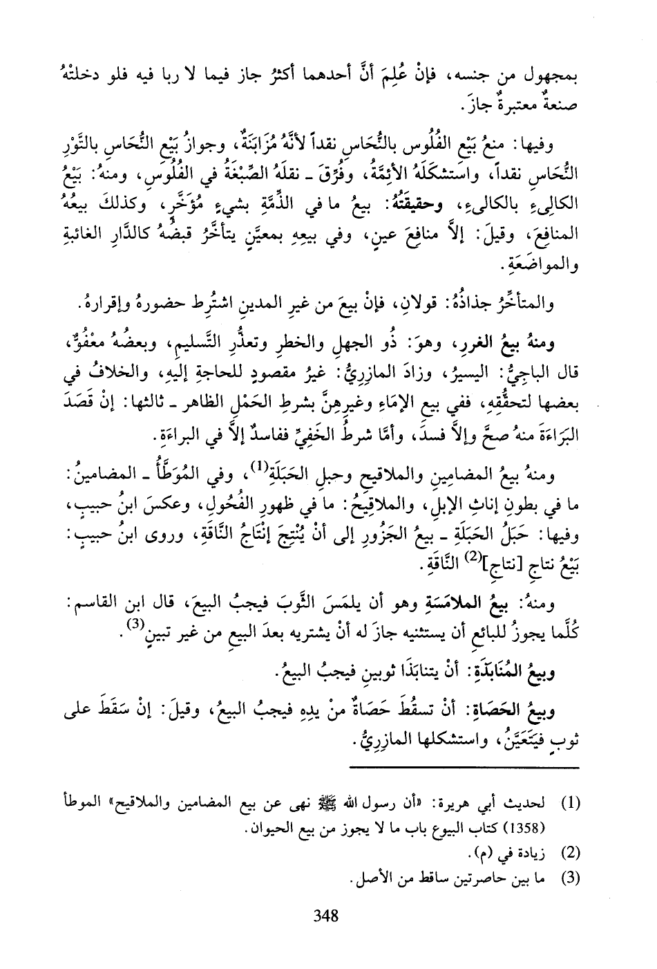 وَمِنْهُ بَيْعُ الْمَضَامِينِ وَالْمَلاقِيحِ وَحَبَلِ الْحَبَلَةِ، وَفِي الْمُوَطَّأِ - الْمَضَامِينُ: مَا فِي بُطُونِ إِنَاثِ الإِبِلِ، وَالْمَلاقِيحُ: مَا فِي ظُهُورِ الْفُحُولِ، وَعَكَسَ ابْنُ حَبِيبٍ، وَفِيهَا: حَبَلُ الْحَبَلَةِ - بَيْعُ الْجَزُورِ إِلَى أَنْ يُنْتِجَ إِنْتَاجُ النَّاقَةِ، وَرَوَى ابْنُ حَبِيبٍ: بَيْعُ نِتَاجِ [نِتَاجِ] النَّاقَةِ.