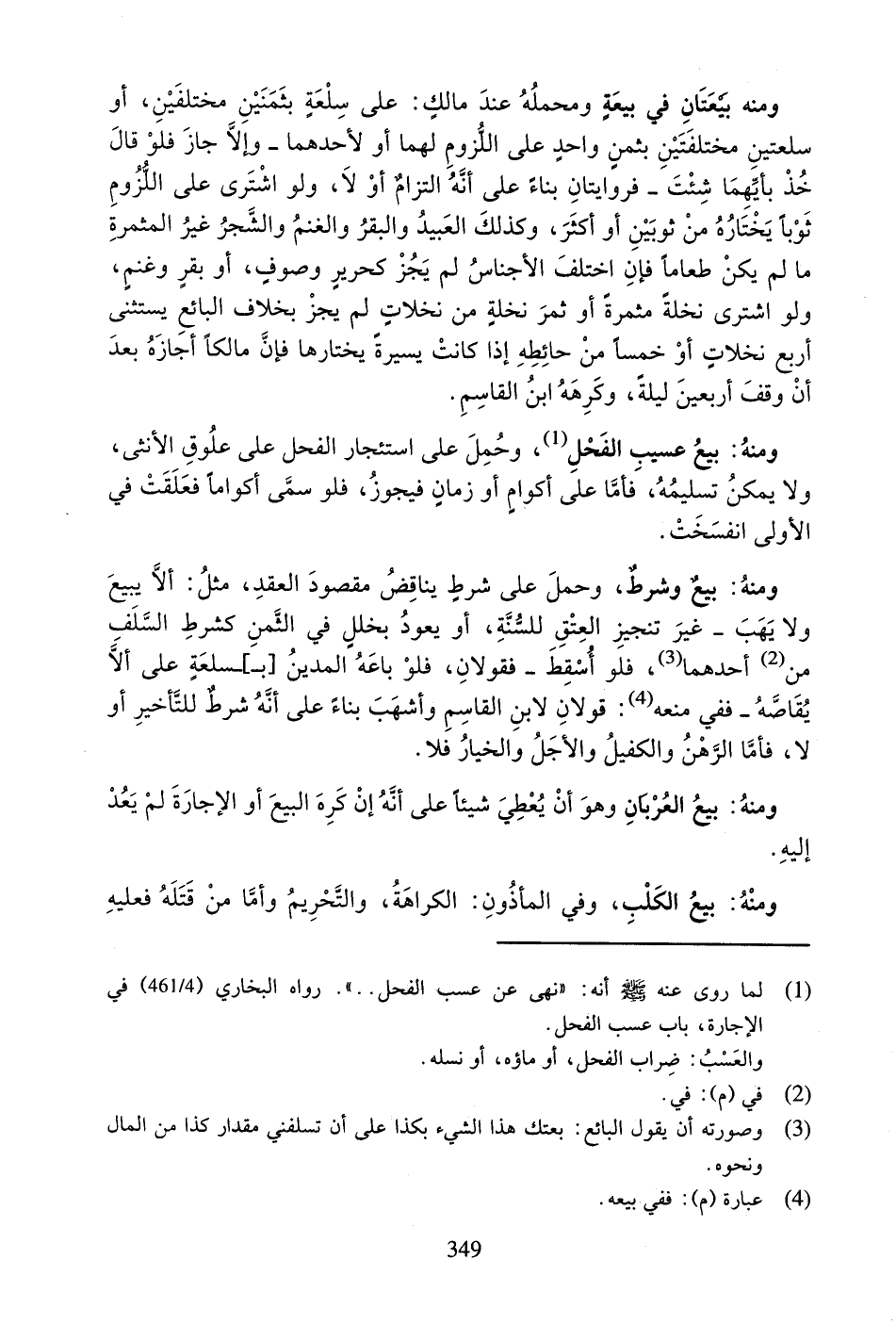 وَمِنْهُ بَيْعَتَانِ فِي بَيْعَةٍ وَمَحْمَلُهُ عِنْدَ مَالِكٍ: عَلَى سِلْعَةٍ بِثَمَنَيْنِ مُخْتَلِفَيْنِ، أَوْ سِلْعَتَيْنِ مُخْتَلِفَتَيْنِ بِثَمَنٍ وَاحِدٍ عَلَى اللُّزُومِ لَهُمَا أَوْ لأَحَدِهِمَا - وَإِلا جَازَ فَلَوْ قَالَ: خُذْ بِأَيِّهِمَا شِئْتَ - فَرِوَايَتَانِ بِنَاءً عَلَى أَنَّهُ الْتِزَامٌ أَوْ لا، وَلَوِ اشْتَرَى عَلَى اللُّزُومِ ثَوْباً يَخْتَارُهُ مِنْ ثَوْبَيْنِ أَوْ أَكْثَرَ، وَكَذَلِكَ الْعَبِيدُ وَالْبَقَرُ وَالْغَنَمُ وَالشَّجَرُ غَيْرُ الْمُثْمِرَةِ مَا لَمْ يَكُنْ طَعَاماً فَإِنِ اخْتَلَفَ الأَجْنَاسُ لَمْ يَجُزْ كَحَرِيرٍ وَصُوفٍ، أَوْ بَقَرٍ وَغَنَمٍ، وَلَوِ اشْتَرَى نَخْلَةً مُثْمِرَةً أَوْ ثَمَرَ نَخْلَةٍ مِنْ نَخَلاتٍ لَمْ يَجُزْ بِخِلافِ الْبَائِع يَسْتَثْنِي أَرْبَعَ نَخَلاتٍ أَوْ خَمْساً مِنْ حَائِطِهِ إِذَا كَانَتْ يَسِيرَةً يَخْتَارُهَا فَإِنَّ مَالِكاً أَجَازَهُ بَعْدَ أَنْ وَقَفَ أَرْبَعِينَ لَيْلَةً، وَكَرِهَهُ ابْنُ الْقَاسِمِ.