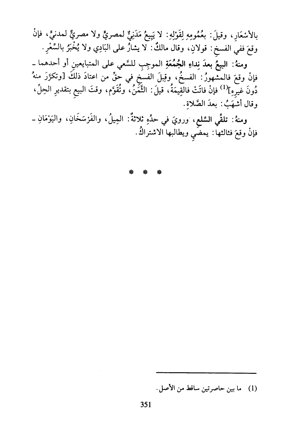 وَمِنْهُ: الْبَيْعُ بَعْدَ نِدَاءِ الْجُمُعَةِ الْمُوجِبِ لِلسَّعْيِ عَلَى الْمُتَبَابِعَيْنِ أَوْ أَحَدِهِمَا - فَإِنْ وَقَعَ فَالْمَشْهُورُ: الْفَسْخُ، وَقَبْلَ الْفَسْخِ فِي حَقِّ مَنِ اعْتَادَ ذَلِكَ [وَتَكَرَّرَ مِنْهُ دُونَ غَيْرِهِ] فَإِنْ فَاتَتْ فَالْقِيمَةُ، قِيلَ: الثَّمَنُ، وَتُقَوَّمُ، وَقْتَ الْبَيْعِ بِتَقْدِيرِ الْحِلِّ، وَقَالَ أَشْهَبُ: بَعْدَ الصَّلاةِ.
