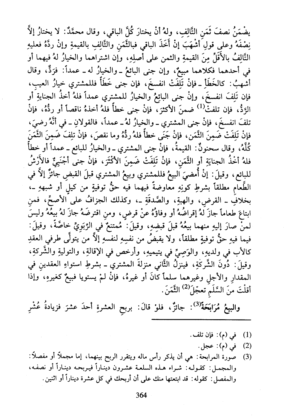 الأَكْثَرَ، فَإِنْ جَنَى خَطَأً فَلَهُ أَخْذُهُ نَاقِصاً أَوْ رَدُّهُ، فَإِنْ تَلِفَ انْفَسَخَ، فَإِنْ جَنَى الْمُشْتَرِي - وَالْخِيَارُ لَهُ - عَمْداً، فَالْقَوْلُانِ - فِي أَنَّهُ رَضِيَ، فَإِنْ تَلِفَتْ ضَمِنَ الثَّمَنَ، فَإِنْ جَنَى خَطَأً فَلَهُ رَدُّهُ وَمَا نَقَصَ، فَإِنْ تَلِفَ ضَمِنَ الثَّمَنَ كُلَّهُ، وَقَالَ سَحْنُونٌ: الْقِيمَةُ، فَإِنْ جَنَى الْمُشْتَرِي - وَالْخِيَارُ لِلْبَائِعِ - عَمْداً أَوْ خَطَأً فَلَهُ أَخْذُ الْجِنَايَةِ أَوِ الثَّمَنِ، فَإِنْ تَلِفَتْ ضَمِنَ الأَكْثَرَ، فَإِنْ جَنَى أَجْنَبِيٌّ فَالأَرْشُ لِلْبَائِعِ، وَقِيلَ: إِنْ أُمْضِيَ الْبَيْعُ فَلِلْمُشْتَرِي وَبَيْعُ الْمُشْتَرِي قَبْلَ الْقَبْضِ جَائِزٌ إِلا فِي الطَّعَامِ مُطْلَقاً بِشَرْطِ كَوْنِهِ مُعَاوَضَةً فِيهِمَا فِيهِ حَقُّ تَوْفِيَةٍ مِنْ كَيْلٍ أَوْ شِبْهِهِ -، بِخِلافِ - الْقَرْضِ، وَالْهِبَةِ، وَالصَّدَقَةِ -، وَكَذَلِكَ الْجُزَافُ عَلَى الأَصَحِّ، فَمَنِ ابْتَاعَ طَعَاماً جَازَ لَهُ إِقْرَاضُهُ أَوْ وَفَاؤُهُ عَنْ قَرْضٍ، وَمَنِ اقْتَرَضَهُ جَازَ لَهُ بَيْعُهُ وَلَيْسَ لِمَنْ صَارَ إِلَيْهِ مِنْهُمَا بَيْعُهُ قَبْلَ قَبْضِهِ، وَقِيلَ: مُمْتَنَعٌ فِي الرِّبَوِيِّ خَاصَّةً، وَقِيلَ: فِيمَا فِيهِ حَقُّ تَوْفِيَةٍ مُطْلَقاً، وَلا يَقْبِضُ مِنْ نَفْسِهِ لِنَفْسِهِ إِلا مِنْ يَتَوَلَّى طَرَفَيِ الْعَقْدِ كَالأَبِ فِي وَلَدَيْهِ، وَالْوَصِيِّ فِي يَتِيمَيْهِ، وَأُرْخِصَ فِي الإِقَالَةِ، وَالتَّوْلِيَةِ وَالشَّرِكَةِ، وَقِيلَ: دُونَ الشَّرِكَةِ، فَيَنْزِلُ الثَّانِي مَنْزِلَةَ الْمُشْتَرِي - بِشَرْطِ اسْتِوَاءِ الْعَقْدَيْنِ فِي الْمِقْدَارِ وَالأَجَلِ وَغَيْرِهِمَا سَلَماً كَانَ أَوْ غَيْرَهُ، فَإِنْ لَمْ يَسْتَوِيَا فَبَيْعٌ