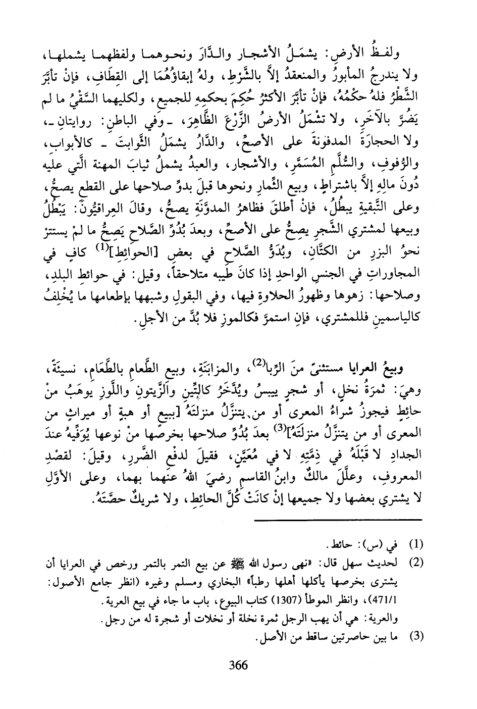وَلَفْظُ الأَرْضِ: يَشْمَلُ الأَشْجَارَ وَالدَّارَ وَنَحْوَهُمَا وَلَفْظُهُمَا يَشْمَلُهَا، وَلا يَنْدَرِجُ الْمَأْبُورُ وَالْمُنْعَقِدُ إِلا بِالشَّرْطِ، وَلَهُ إِبْقَاؤُهُمَا إِلَى الْقِطَافِ، فَإِنْ تَأَبَّرَ الشَّطْرُ فَلَهُ حُكْمُهُ، فَإِنْ تَأَبَّرَ الأَكْثَرُ حُكِمَ بِحُكْمِهِ لِلْجَمِيعِ، وَلِكِلَيْهِمَا السَّقْيُ مَا لَمْ يَضُرَّ بِالآخَرِ، وَلا تَشْمَلُ الأَرْضُ الزَّرْعَ الظَّاهِرَ، - وَفِي الْبَاطِنِ: رِوَايَتَانِ -، وَلا الْحِجَارَةَ الْمَدْفُونَةَ عَلَى الأَصَحِّ، وَالدَّارُ يَشْمَلُ الثَّوَابِتَ - كَالأَبْوَابِ، وَالرُّفُوفِ، وَالسُّلَّمِ الْمُسَمَّرِ، وَالأَشْجَارِ، وَالْعَبْدُ يَشْمَلُ ثِيَابَ الْمِهْنَةِ الَّتِي عَلَيْهِ دُونَ مَالِهِ إِلا بِاشْتِرَاطٍ، وَبَيْعُ الثِّمَارِ وَنَحْوِهَا قَبْلَ بُدُوِّ صَلاحِهَا عَلَى الْقَطْعِ يَصِحُّ، وَعَلَى التَّبْقِيَةِ يَبْطُلُ، فَإِنْ أُطْلِقَ فَظَاهِرُ الْمُدَوَّنَةِ يَصِحُّ، وَقَالَ الْعِرَاقِيُّونَ: يَبْطُلُ وَبَيْعُهَا لِمُشْتَرِي الشَّجَرِ يَصِحُّ عَلَى الأَصَحِّ، وَبَعْدَ بُدُوِّ الصَّلاحِ يَصِحُّ مَا لَمْ يَسْتَتِرْ نَحْوَ الْبِزْرِ مِنَ الْكَتَّانِ، وَبُدُوُّ الصَّلاحِ فِي بَعْضِ [حَائِطٍ] كَافٍ فِي الْمُجَاوِرَاتِ فِي الْجِنْسِ الْوَاحِدِ إِذَا كَانَ طَيِّبُهُ مُتَلاحِقاً، وَقِيلَ: فِي حَوَائِطِ الْبَلَدِ، وَصَلاحُهَا: زَهْوُهَا وَظُهُورُ الْحَلاوَةِ فِيهَا، وَفِي الْبُقُولِ وَشِبْهِهَا بِإْطَعَامِهَا مَا يُخْلِفُ كَالْيَاسَمِينِ فَلِلْمُشْتَرِي، فَإِنِ اسْتَمَرَّ فَكَالْمَوْزِ فَلا بُدَّ مِنَ الأَجَلِ.