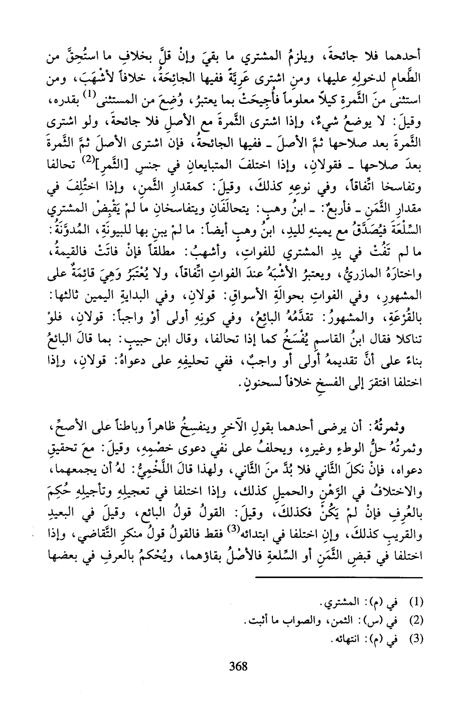 بِخِلافِ مَا اسْتُحِقَّ مِنَ الطَّعَامِ لِدُخُولِهِ عَلَيْهَا، وَمَنِ اشْتَرَى عَرِيَّةً فَفِيهَا الْجَائِحَةُ، خِلافاً لأَشْهَبَ، وَمَنِ اسْتَثْنَى مِنَ الثَّمَرَةِ كَيْلاً مَعْلُوماً فَأُجِيحَتْ بِمَا يُعْتَبَرُ، وُضِعَ مِنَ الْمُسْتَثْنَى (¬1) بِقَدْرِهِ، وَقِيلَ: لا يُوضَعُ شَيْءٌ، وَإِذَا اشْتَرَى الثَّمَرَةَ مَعَ الأَصْلِ فَلا جَائِحَةَ، وَلَوِ اشْتَرَى الثَّمَرَةَ بَعْدَ صَلاحِهَا ثُمَّ الأَصْلَ - فَفِيهَا الْجَائِحَةُ، فَإِنِ اشْتَرَى الأَصْلَ ثُمَّ الثَّمَرَةَ بَعْدَ صَلاحِهَا - فَقَوْلانِ، وَإِذَا اخْتَلَفَ الْمُتَبَايِعَانِ فِي جِنْسِ [الثَّمَنِ] تَحَالَفَا وَتَفَاسَخَا اتِّفَاقاً، وَفِي نَوْعِهِ كَذَلِكَ، وَقِيلَ: كَمِقْدَارِ الثَّمَنِ، وَإِذَا اخْتُلِفَ فِي مِقْدَارِ الثَّمَنِ - فَأَرْبَعٌ: - ابْنُ وَهْبٍ: يَتَحَالَفَانِ وَيَتَفَاسَخَانِ مَا لَمْ يَقْبِضِ الْمُشْتَرِي السِّلْعَةَ فَيُصَدَّقُ مَعَ يَمِينِهِ لِلْيَدِ، ابْنُ وَهْبٍ أَيْضاً: مَا لَمْ يَبْنِ بِهَا لِلْبُيُونَةِ، الْمُدَوَّنَةُ: مَا لَمْ تَفُتْ فِي يَدِ الْمُشْتَرِي لِلْفَوَاتِ، وَأَشْهَبُ: مُطْلَقاً فَإِنْ فَاتَتْ فَالْقِيمَةُ، وَاخْتَارَهُ الْمَازِرِيُّ، وَيُعْتَبَرُ الأَشْبَهُ عِنْدَ الْفَوَاتِ اتِّفَاقاً، وَلا يُعْتَبَرُ وَهِيَ قَائِمَةٌ عَلَى الْمَشْهُورِ، وَفِي الْفَوَاتِ بِحَوَالَةِ الأَسْوَاقِ: قَوْلانِ، وَفِي الْبِدَايَةِ الْيَمِينُ ثَالِثُهَا: بِالْقُرْعَةِ، وَالْمَشْهُورُ: تَقَدُّمُهُ الْبَائِعَ، وَفِي كَوْنِهِ أَوْلَى أَوْ وَاجِباً: قَوْلانِ، فَلَوْ تَنَاكَلا فَقَالَ ابْنُ الْقَاسِمِ: يُفْسَخُ كَمَا إِذَا تَحَالَفَا، وَقَالَ ابْنُ حَبِيبٍ: بِمَا قَالَ الْبَائِعُ بِنَاءً عَلَى أَنَّ تَقْدِيمَهُ أَوْلَى