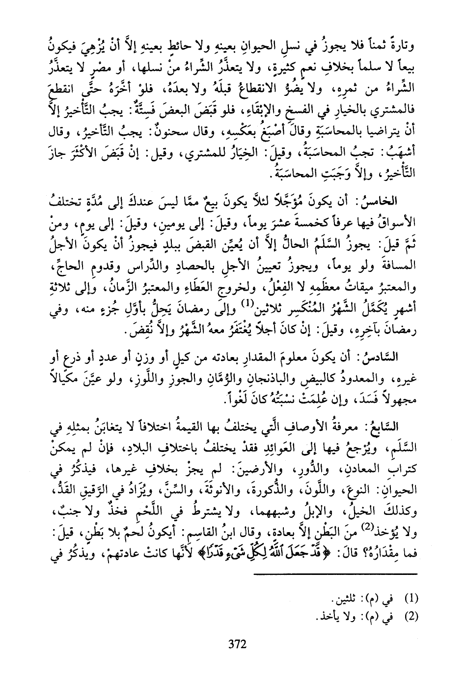السَّابِعُ: مَعْرِفَةُ الأَوْصَافِ الَّتِي يَخْتَلِفُ بِهَا الْقِيمَةُ اخْتِلافا لا يُتَغَابَنُ بِمِثْلِهِ فِي السَّلَمِ، وَيُرْجَعُ فِيهَا إِلا الْعَوَائِدِ فَقَدْ يَخْتَلِفُ بِاخْتِلافِ الْبِلادِ، فَإِنْ لَمْ يُمْكِنْ كَتُرَابِ الْمَعَادِنِ، وَالدُّورِ، وَالأَرَضِينَ: لَمْ يَجُزْ بِخِلافِ غَيْرِهَا، فَيَذْكُرُ فِي الْحَيَوَانِ: النَّوْعَ، وَاللَّوْنَ، وَالذُّكُورَةَ، وَالأُنُوثَةَ، وَالسِّنَّ، وَيُزَادُ فِي الرَّقِيقِ الْقَدُّ، وَكَذَلِكَ الْخَيْلُ، وَالإِبِلُ وَشِبْهُهُمَا، وَلا يُشْتَرَطُ فِي اللَّحْمِ فَخِذٌ وَلا جَنْبٌ، وَلا يُؤْخَذُ (¬2) مِنَ الْبَطْنِ إِلا بِعَادَةٍ، وَقَالَ ابْنُ الْقَاسِمِ: أَيَكُونُ لَحْمٌ بِلا بَطْنٍ، قِيلَ: فَمَا مِقْدَارُهُ؟ قَالَ: (قَدْ جَعَلَ اللَّهُ لِكُلِّ شَيْءٍ قَدْراً) لأَنَّهَا كَانَتْ عَادَتَهُمْ، وَيَذْكُرُ فِي