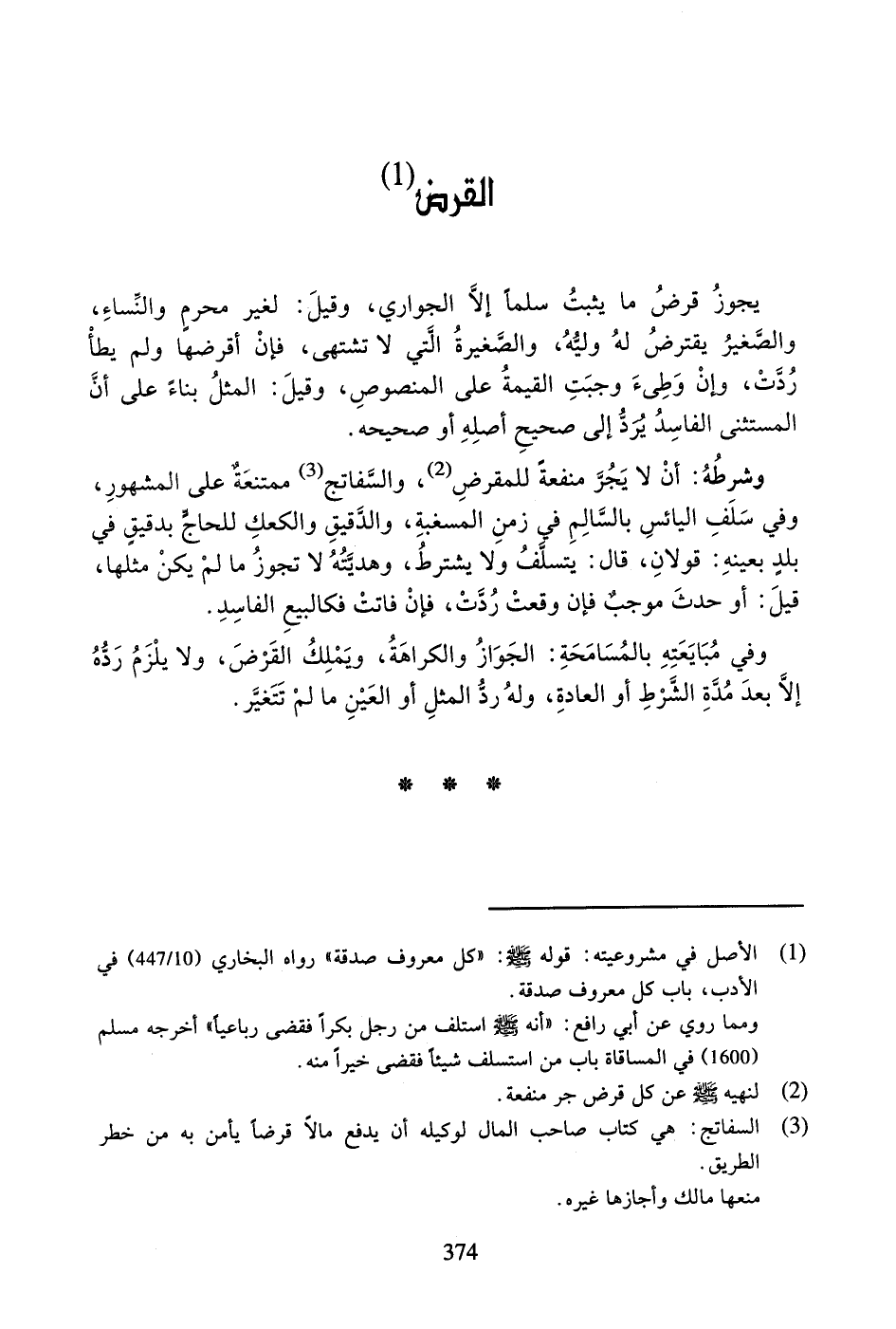 وَشَرْطُهُ: أَنْ لا يَجُرَّ مَنْفَعَةً لِلْمُقْرِضِ، وَالسَّفَاتِجُ مُمْتَنَعَةٌ عَلَى الْمَشْهُورِ، وَفِي سَلَفِ الْيَائِسِ بِالسَّالِمِ فِي زَمَنِ الْمَسْغَبَةِ، وَالدَّقِيقِ وَالْكَعْكِ لِلْحَاجِّ بِدَقِيقٍ فِي بَلَدٍ بِعَيْنِهِ: قَوْلانِ، قَالَ: يَتَسَلَّفُ وَلا يَشْتَرِطُ، وَهَدِيَّتُهُ لا تَجُوزُ مَا لَمْ يَكُنْ مِثْلُهَا، قِيلَ: أَوْ حَدَثَ مُوجِبٌ فَإِنْ وَقَعَتْ رُدَّتْ، فَإِنْ فَاتَتْ فَكَالْبَيْعِ الْفَاسِدِ.