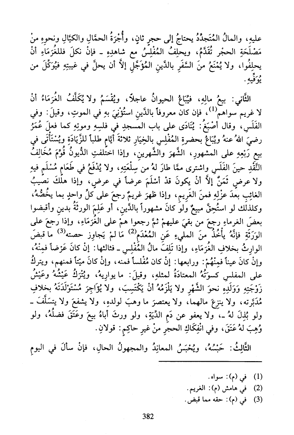 الثَّانِي: بَيْعُ مَالِهِ، فَيُبَاعُ الْحَيَوَانُ عَاجِلاً، وَيُقْسَمُ وَلا يُكَلَّفُ الْغُرَمَاءُ أَنْ لا غَرِيمَ سِوَاهُمْ (¬1)، فَإِنْ كَانَ مَعْرُوفاً بِالدَّيْنِ اسْتُؤْنِيَ بِهِ فِي الْمَوْتِ، وَقِيلَ: وَفِي الْفَلَسِ: وَقَالَ أَصْبَغُ: يُنَادَى عَلَى بَابِ الْمَسْجِدِ فِي فَلَسِهِ وَمَوْتِهِ كَمَا فَعَلَ عُمَرُ رَضِيَ اللَّهُ عَنْهُ وَيُبَاعُ بِحَضْرَةِ الْمُفْلِسِ بِالْخِيَارِ ثَلاثَةَ أَيَّامٍ طَلَباً لِلزِّيَادَةِ وَيُسْتَأْتَى فِي بَيْعِ رَبْعِهِ عَلَى الْمَشْهُورِ، الشَّهْرَ وَالشَّهْرَيْنِ، وَإِذَا اخْتَلَفَتِ الدُّيُونُ قُوِّمَ مُخَالِفُ النَّقْدِ حِينَ الْفَلَسِ وَاشْتَرَى مِمَّا طَارَ لَهُ مِنْ سِلْعَتِهِ، وَلا يُدْفَعُ فِي طَعَامٍ مُسْلَمٍ فِيهِ وَلا عَرْضٍ ثَمَنٌ إِلا أَنْ يَكُونَ قَدْ أَسْلَمَ عَرْضاً فِي عَرْضٍ، وَإِذَا هَلَكَ نَصِيبُ الْغَائِبِ بَعْدَ عَزْلِهِ فَمِنَ الْغَرِيمِ، وَإِذَا ظَهَرَ غَرِيمٌ رَجَعَ عَلَى كُلِّ وَاحِدٍ بِمَا يَخُصُّهُ، وَكَذَلِكَ لَوِ اسْتُحِقَّ مَبِيعٌ وَلَوْ كَانَ مَشْهُوراً بِالدَّيْنِ، أَوْ عَلِمَ الْوَرَثَةُ بِدَيْنٍ وَأَقْبَضُوا بَعْضَ الْغُرَمَاءِ رَجَعَ مَنْ بَقِيَ عَلَيْهِمْ ثُمَّ رَجَعُوا هُمْ عَلَى الْغُرَمَاءِ، وَإِذَا رَجَعَ عَلَى الْوَرَثَةِ فَإِنَّهُ يَأْخُذُ مِنَ الْمَلِيءِ عَنِ الْمُعْدَمِ مَا لَمْ يُجَاوِزْ حِصَّتَهُ (¬2)