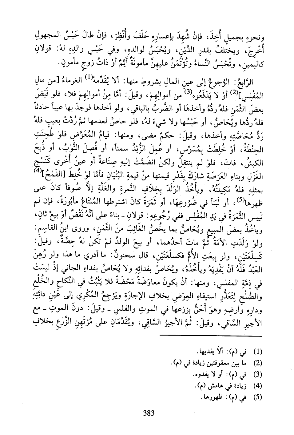 الرَّابِعُ: الرُّجُوعُ إِلَى عَيْنِ الْمَالِ بِشُرُوطٍ مِنْهَا: أَلا يُقَدِّمَهُ (¬1) الْغُرَمَاءُ [مِنْ مَالِ الْمُفْلِسِ] أَوْ لا يَدْفَعُوهُ (¬2) مِنْ أَمْوَالِهِمْ، وَقِيلَ: أَمَّا مِنْ أَمْوَالِهِمْ فَلا، فَلَوْ قَبَضَ بَعْضَ الثَّمَنِ فَلَهُ رَدُّهُ وَأَخَذَهَا أَوِ الضَّرْبُ بِالْبَاقِي، وَلَوْ أَخَذَهَا فَوَجَدَ بِهَا عَيْباً حَادِثاً فَلَهُ رَدُّهَا وَيُحَاصُّ، أَوْ حَبْسُهَا وَلا شَيْءَ لَهُ، فَلَهُ حَاصَّ لِعَدَمِهَا ثُمَّ رُدَّتْ بِعَيْبٍ فَلَهُ رَدُّ مُحَاصَّتِهِ وَأَخْذُهَا، وَقِيلَ: حُكْمٌ مَضَى، وَمِنْهَا: قِيَامُ الْمُعَوِّضِ فَلَوْ طُحِنَتِ الْحِنْطَةُ، أَوْ خُلِطَتْ بِمُسَوِّسٍ، أَوْ عُمِلَ الزُّبْدُ سَمْناً، أَوْ فُصِلَ الثَّوْبُ، أَوْ ذُبِحَ الْكَبْشُ، فَاتَ، فَلَهُ لَمْ يَنْتَقِلْ وَلِكَنِ انْضَمَّتْ إِلَيْهِ صِنَاعَةٌ أَوْ عَيْنٌ أُخْرَى كَنَسْجِ الْغَزْلِ وَبِنَاءِ الْعَرَصَةِ شَارَكَ بِقَدْرِ قِيمَتِهَا مِنْ قِيمَةِ الْبُنْيَانِ فَأَمَّا لَوْ خُلِطَ [الْقَمْحُ] بِمِثْلِهِ فَلَهُ مَكِيلَتُهُ، وَيَأْخُذُ الْوَلَدَ بِخِلافِ الثَّمَرَةِ وَالْغَلَّةِ إِلا صُوفاً كَانَ عَلَى ظَهْرِهَا (¬3)،