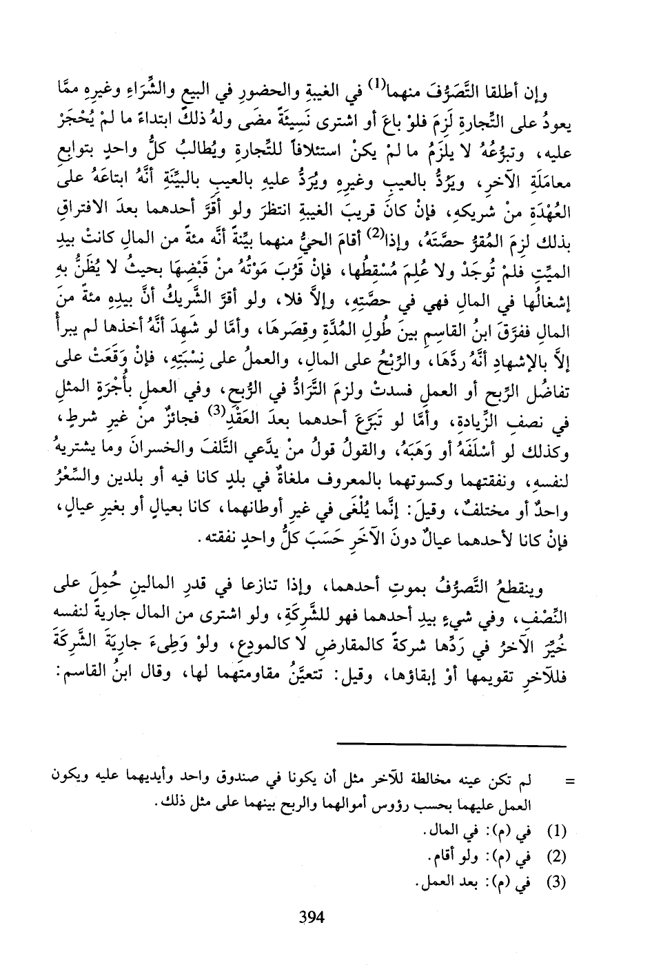 وَإِنْ أَطْلَقَا التَّصَرُّفَ مِنْهُمَا (1) فِي الْغَيْبَةِ وَالْحُضُورِ فِي الْبَيْعِ وَالشِّرَاءِ وَغَيْرِهِ مِمَّا يَعُودُ عَلَى التِّجَارَةِ لَزِمَ فَلَوْ بَاعَ أَوِ اشْتَرَى نَسِيئَةً مَضَى وَلَهُ ذَلِكَ ابْتِدَاءً مَا لَمْ يُحْجَرْ عَلَيْهِ، وَتَبَرُّعُهُ لا يَلْزَمُ مَا لَمْ يَكُنِ اسْتِئْلافاً لِلتِّجَارَةِ وَيُطَالَبُ كُلُّ وَاحِدٍ بِتَوَابِعِ مُعَامَلَةِ الآخَرِ، وَيُرَدُّ بِالْعَيْبِ وَغَيْرِهِ وَيُرَدُّ عَلَيْهِ بِالْعَيْبِ بِالْبَيِّنَةِ أَنَّهُ ابْتَاعَهُ عَلَى الْعُهْدَةِ مِنْ شَرِيكِهِ، فَإِنْ كَانَ قَرِيبَ الْغَيْبَةِ انْتَظَرَ وَلَوْ أَقَرَّ أَحَدُهُمَا بَعْدَ الافْتِرَاقِ بِذَلِكَ لَزِمَ الْمُقِرَّ حِصَّتُهُ، وَإِذَا (¬1) أَقَامَ الْحَيُّ مِنْهُمَا بَيِّنَةً أَنَّهُ مِئَةٌ مِنَ الْمَالِ كَانَتْ بِيَدِ الْمَيِّتِ فَلَمْ تُوجَدْ وَلا عُلِمَ مُسْقِطُهَا، فَإِنْ قَرُبَ مَوْتُهُ مِنْ قَبْضِهَا بِحَيْثُ لا يُظَنُّ بِهِ إِشْغَالُهَا فِي الْمَالِ فَهِيَ فِي حِصَّتِهِ، وَإِلا فَلا، وَلَوْ أَقَرَّ الشَّرِيكُ أَنَّ بِيَدِهِ مِئَةً مِنَ الْمَالَ فَفَرَّقَ ابْنُ الْقَاسِمِ بَيْنَ طُولِ الْمُدَّةِ وَقِصَرِهَا، وَأَمَّا لَوْ شَهِدَ أَنَّهُ أَخَذَهَا لَمْ يَبْرَأْ إِلا بِالإِشْهَادِ أَنَّهُ رَدَّهَا، وَالرِّبْحُ عَلَى الْمَالِ، وَالْعَمَلُ عَلَى نِسْبَتِهِ، فَإِنْ وَقَعَتْ عَلَى تَفَاضُلِ الرِّبْحِ أَوِ الْعَمَلِ فَسَدَتْ وَلَزِمَ التَّرَادُّ فِي الرِّبْحِ، وَفِي الْعَمَلِ بِأُجْرَةِ الْمِثْلِ فِي نِصْفِ الزِّيَادَةِ، وَأَمَّا لَوْ تَبَرَّعَ أَحَدُهُمَا بَعْدَ الْعَقْدِ (¬2)