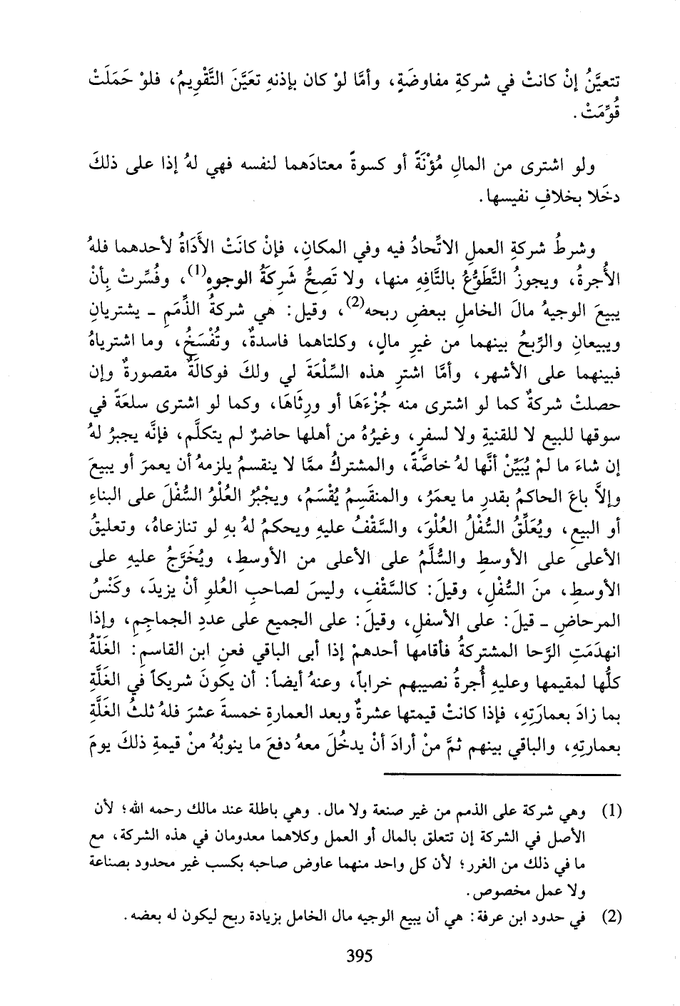 وَشَرْطُ شَرِكَةِ الْعَمَلِ الاتِّحَادُ فِيهِ وَفِي الْمَكَانِ، فَإِنْ كَانَتِ الأَدَاةُ لأَحَدِهِمَا فَلَهُ الأُجْرَةُ، وَيَجُوزُ التَّطَوُّعُ بِالتَّافِهِ مِنْهَا، وَلا تَصِحُّ شَرِكَةُ الْوُجُوهِ، وَفُسِّرَتْ بِأَنْ يَبِيعَ الْوَجِيهُ مَالَ الْخَامِلِ بِبَعْضِ رِبْحِهِ، وَقِيلَ: هِيَ شَرِكَةُ الذِّمَمِ - يَشْتَرِيَانِ وَيَبِيعَانِ وَالرِّبْحُ بَيْنَهُمَا مِنْ غَيْرِ مَالِ، ٍ وَكِلْتَاهُمَا فَاسِدَةٌ، وَتُفْسَخُ، وَمَا اشْتَرَيَاهُ فَبَيْنَهُمَا عَلَى الأَشْهَرِ، وَأَمَّا اشْتَرِ هَذِهِ السِّلْعَةَ لِي وَلَكَ فَوَكَالَةٌ مَقْصُورَةٌ وَإِنْ حَصَلَتْ شَرِكَةٌ كَمَا لَوِ اشْتَرَى مِنْهُ جُزْءَهَا أَوْ وَرِثَاهَا، وَكَمَا لَوِ اشْتَرَى سِلْعَةً فِي سُوقِهَا لِلْبَيْعِ لا لِلْقِنْيَةِ وَلا لِسَفَرٍ، وَغَيْرُهُ مِنْ أَهْلِهَا حَاضِرٌ لَمْ يَتَكَلَّمْ، فَإِنَّهُ يُجْبَرُ لَهُ إِنْ شَاءَ مَا لَمْ يُبَيِّنْ أَنَّهَا لَهُ خَاصَّةً، وَالْمُشْتَرِكُ مِمَّا لا يَنْقَسِمُ يَلْزَمُهُ أَنْ يُعْمِرَ أَوْ يَبِيعَ وَإِلا بَاعَ الْحَاكِمُ بِقَدْرِ مَا يُعْمَرُ، وَالْمُنْقَسِمُ يُقْسَمُ، وَيُجْبَرُ الْعُلْوُ السُّفْلَ عَلَى الْبِنَاءِ أَوِ الْبَيْعِ، وَيُعَلَّقُ السُّفْلُ الْعُلْوَ، وَالسُّقْفُ عَلَيْهِ وَيُحْكَمُ لَهُ بِهِ لَوْ تَنَازَعَاهُ، وَتَعْلِيقُ الأَعْلَى عَلَى الأَوْسَطِ وَالسُّلَّمِ عَلَى الأَعْلَى مِنَ الأَوْسَطِ، وَيُخَرَّجُ عَلَيْهِ عَلَى الأَوْسَطِ، مِنَ السُّفْلِ، وَقِيلَ: كَالسَّقْفِ، وَلَيْسَ لِصَاحِبِ الْعُلْوِ أَنْ يَزِيدَ، وَكَنْسُ الْمِرْحَاضِ - قِيلَ: عَلَى الأَسْفَلِ، وَقِيلَ: عَلَى الْجَمِيعِ عَلَى عَدَدِ الْجَمَاجِمِ، وَإِذَا انْهَدَمَتِ الرَّحَا الْمُشْتَرِكَةُ فَأَقَامَهَا أَحَدُهُمْ إِذَا أَبَى الْبَاقِي